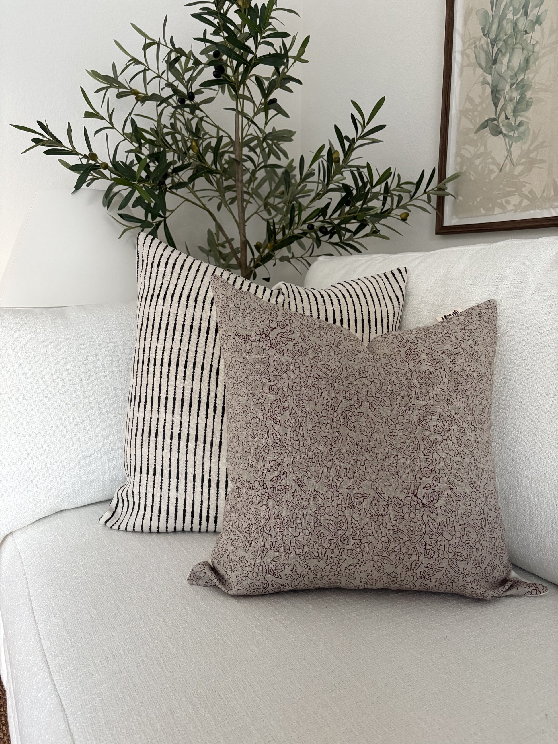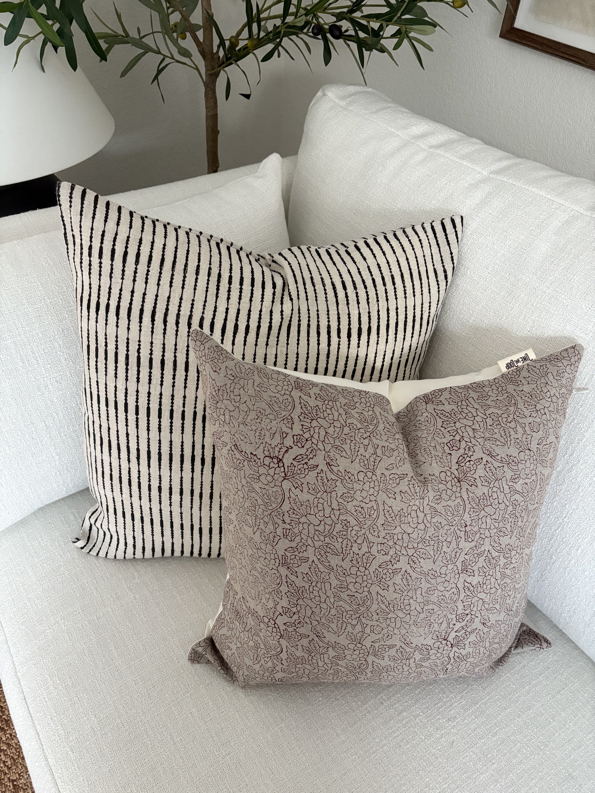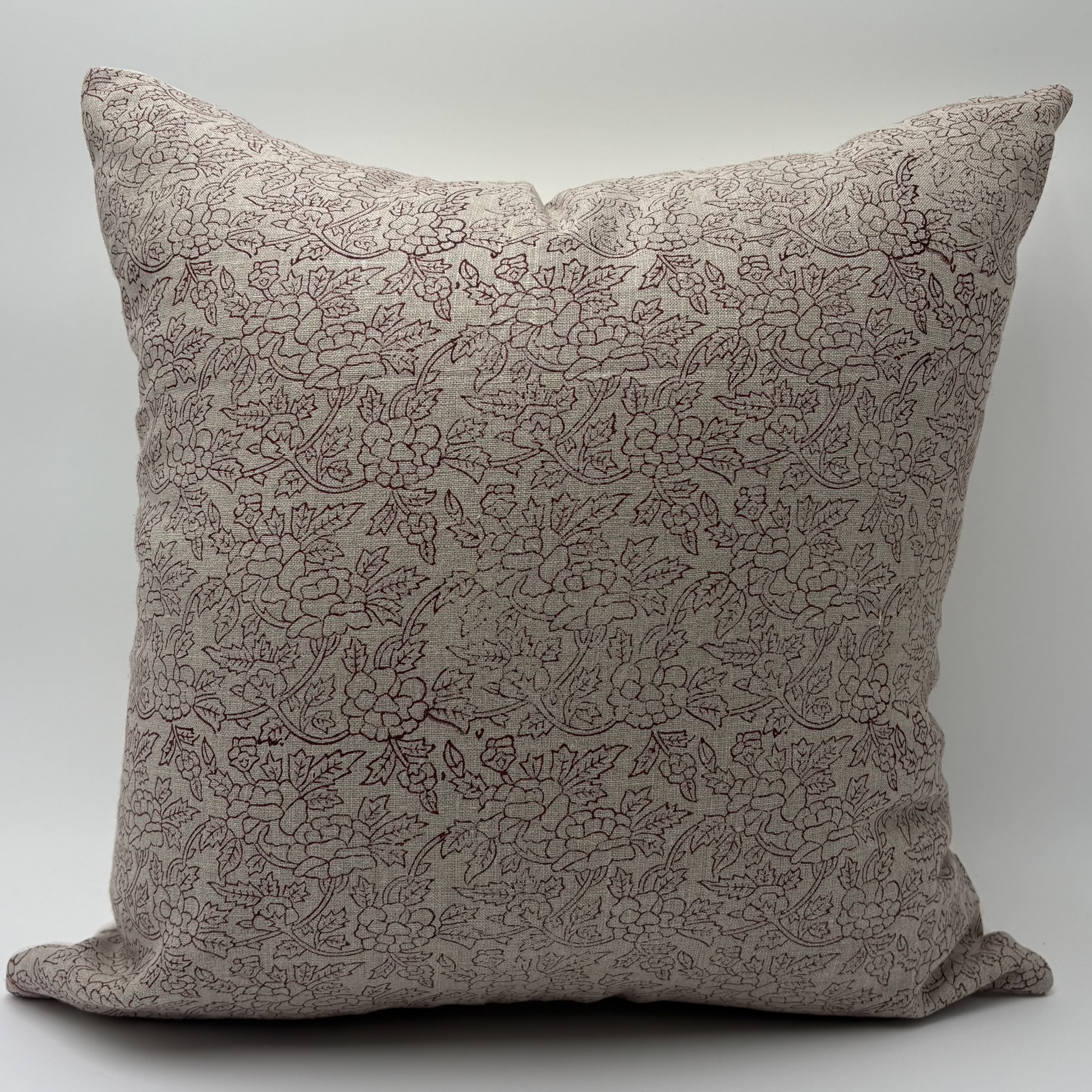 The block print on the linen is entirely done by hand, by master artisans. This is a four-hundred-year-old art form that has been passed down generations and takes an incredible amount of precision and practice to get right. The blocks are carved by artisans, the colors are mixed by a master color artist, and it is then printed on by a block printer. The linen is then air dried and then stitched into cushion covers.