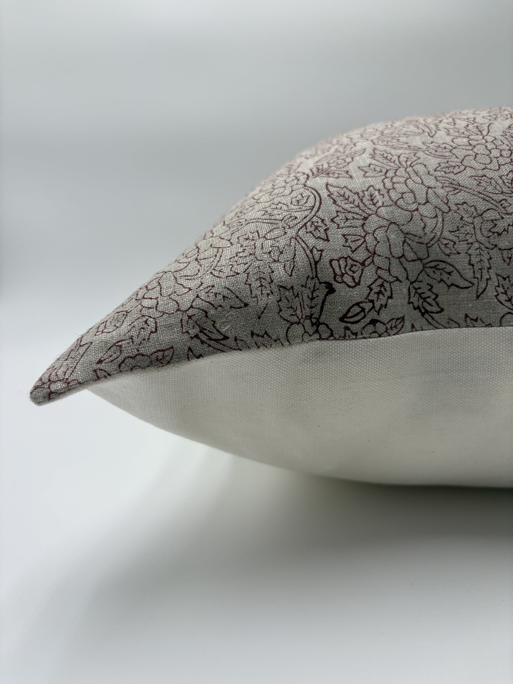 The front is made of 100% linen and the back is made of durable duck cotton. The pillow cover can also be ordered with back and front block printed linen (double-sided)