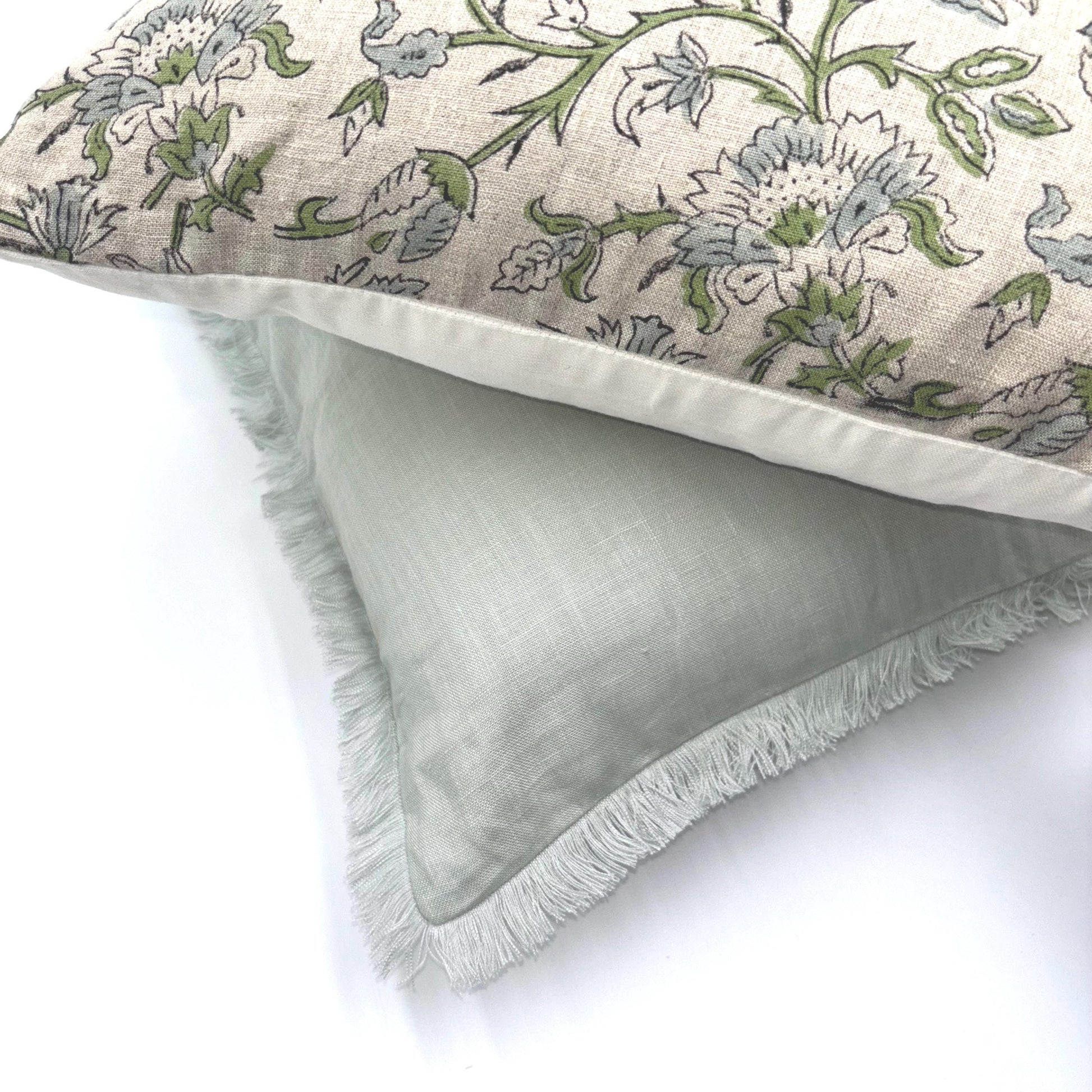 Our "Claire" pillow cover features a floral pattern with spring green and pale blue flowers on a light oatmeal background. This calming color palette screams spring and goes well with blue and green cushions