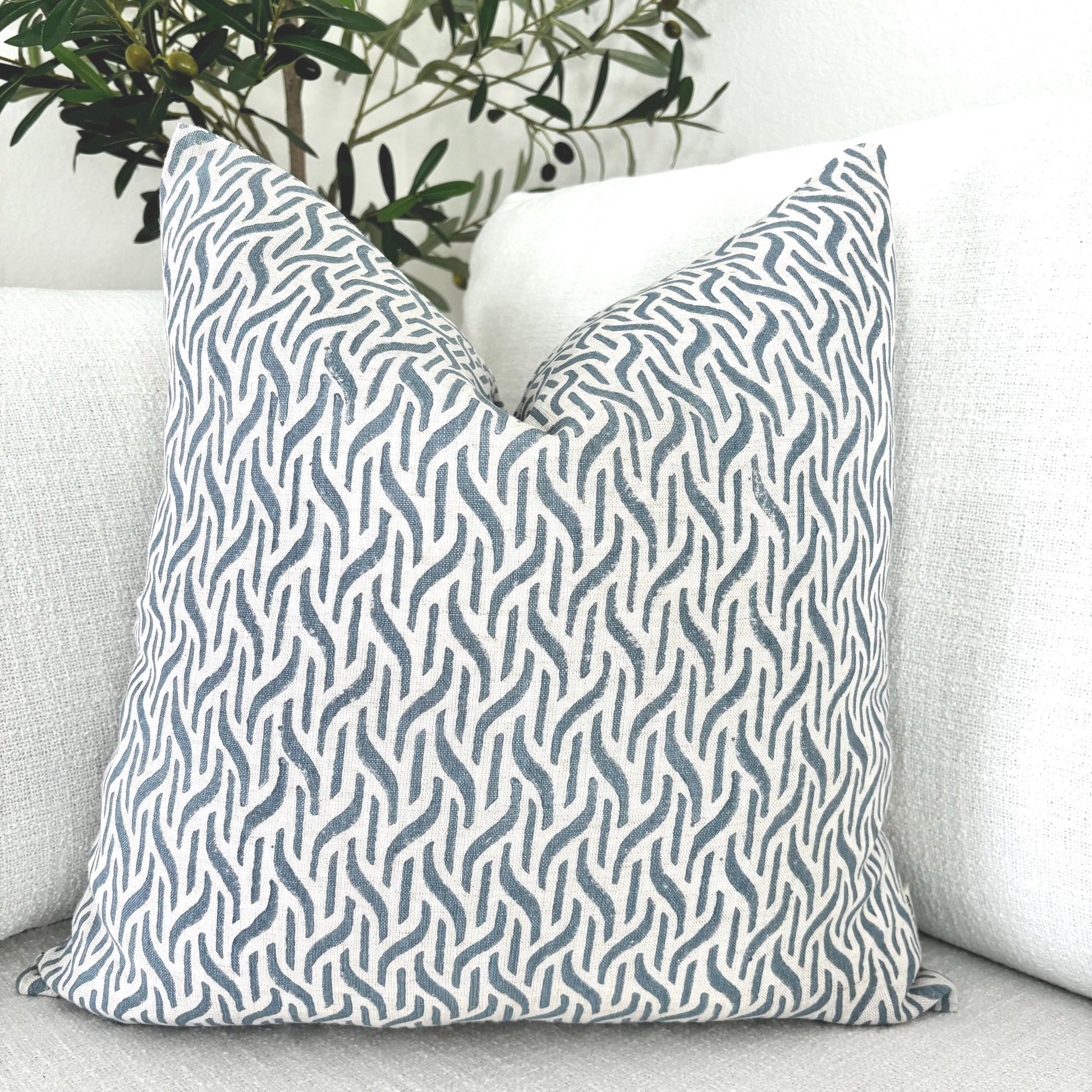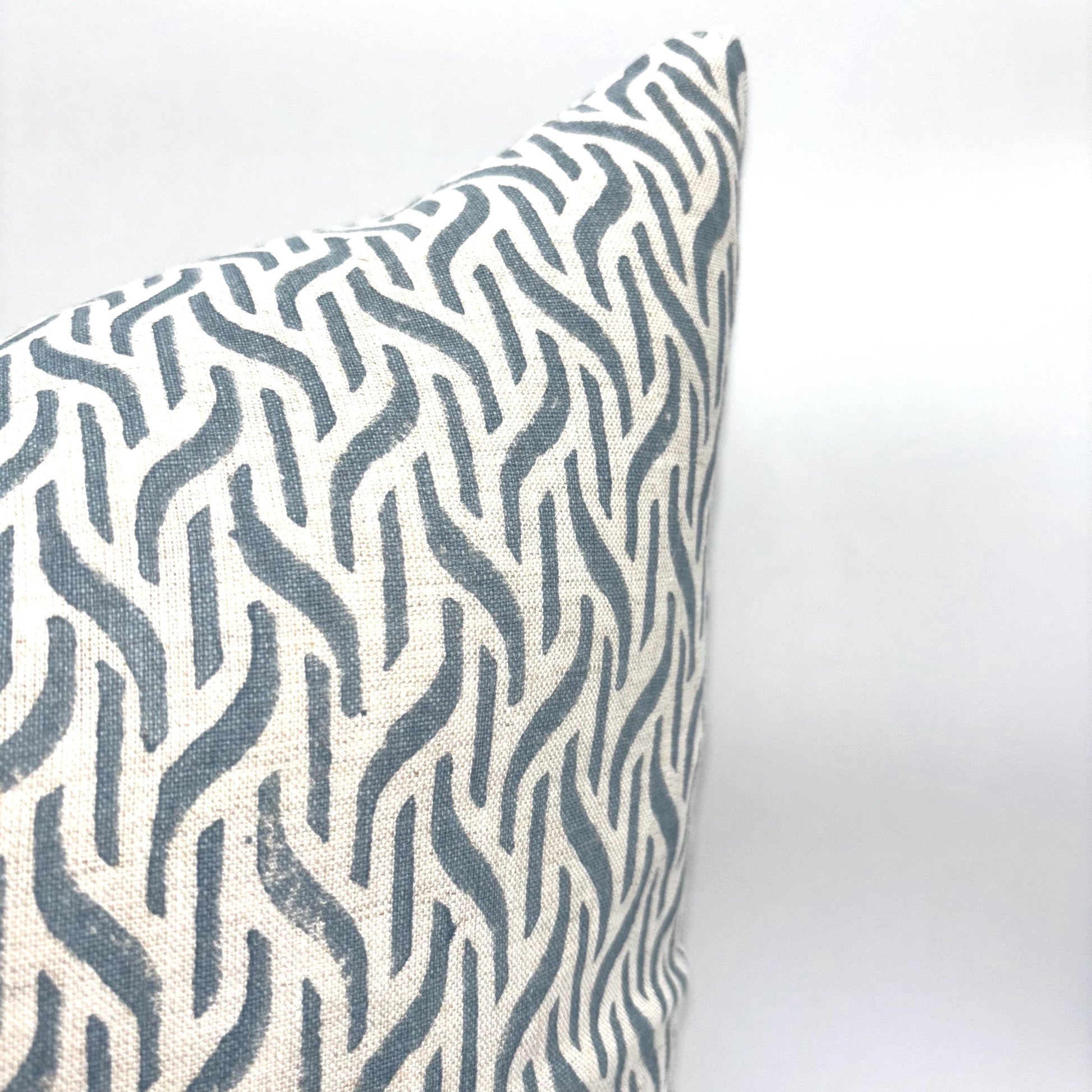 Our "Odetta" pillow cover features a geometric pattern in blue gray on an oatmeal background. This versatile pattern pairs well with oatmeal-colored, blue, gray and white pillows