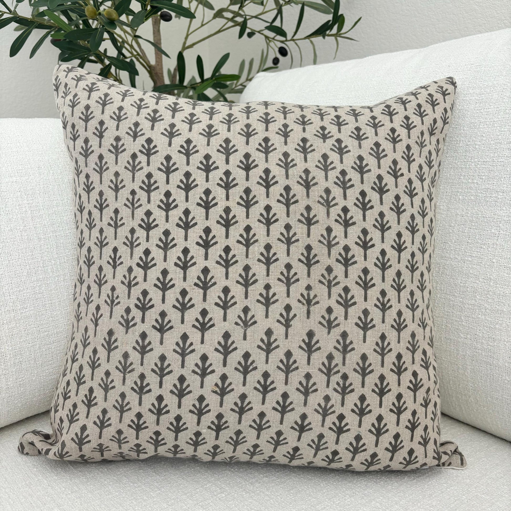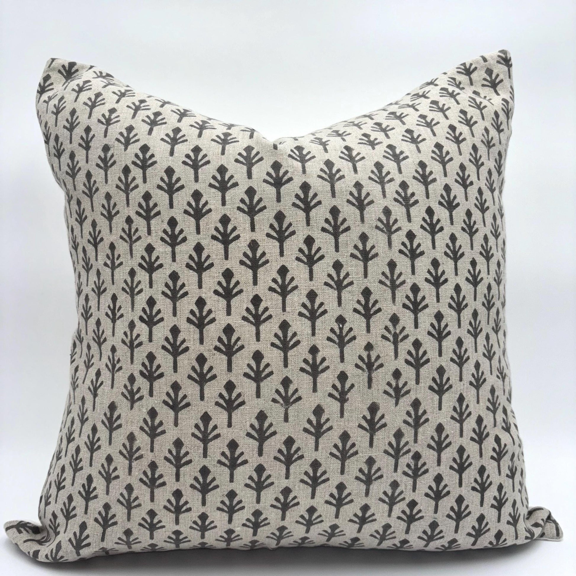 Our "Alice" pillow cover features a slate gray pine tree pattern on a light oatmeal beige background. This neutral color palette goes well with gray and beige pillows.