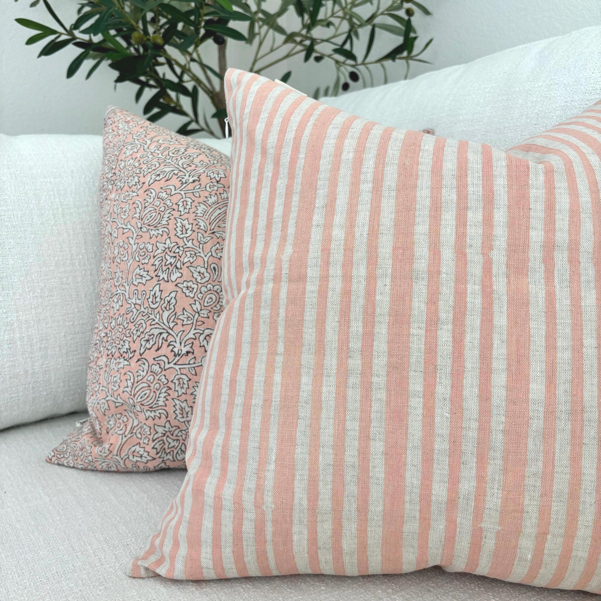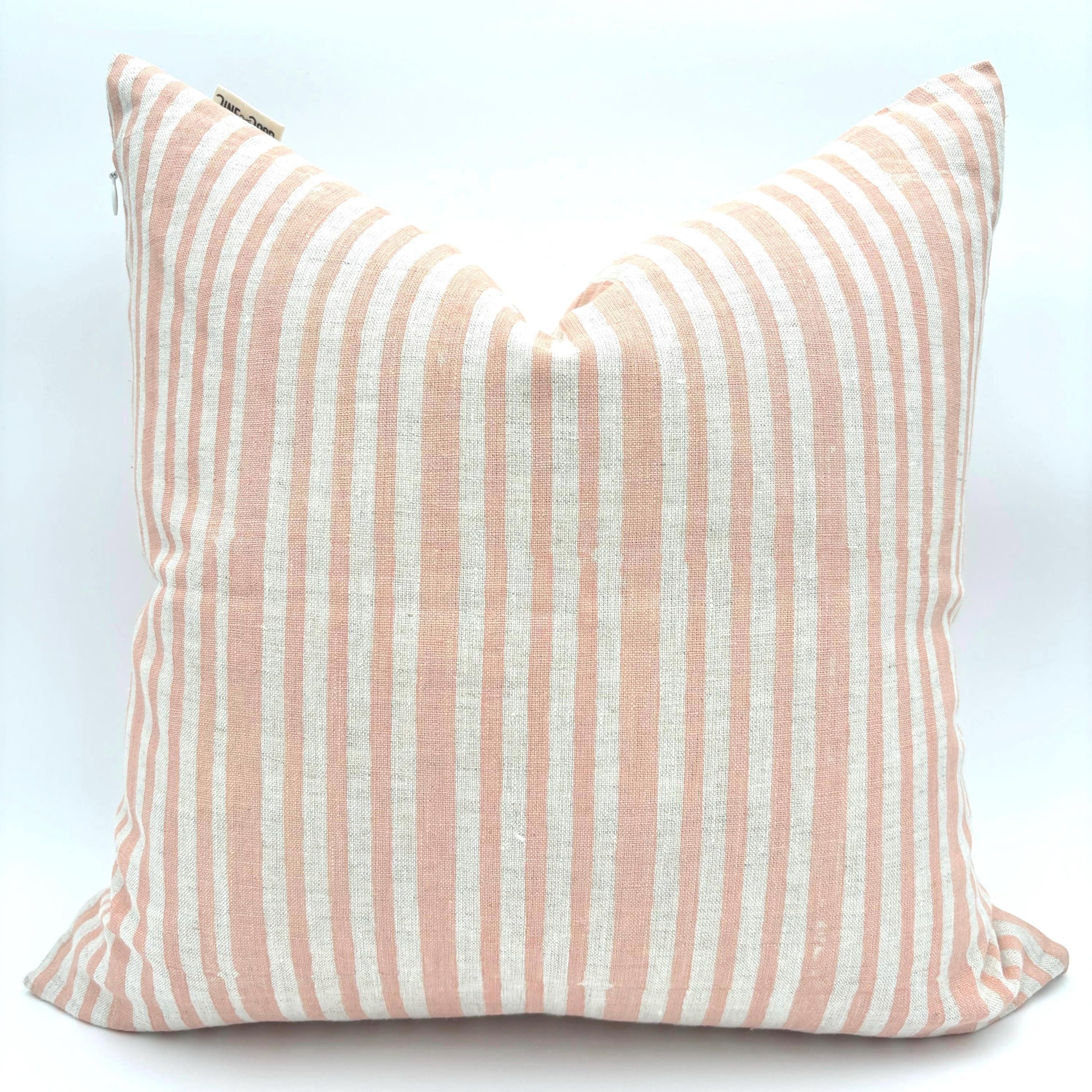 Our "Liam" pillow cover features delicate light pink colored stripes on a light oatmeal-colored background. This versatile pattern pairs well with oatmeal-colored, pink and white pillows