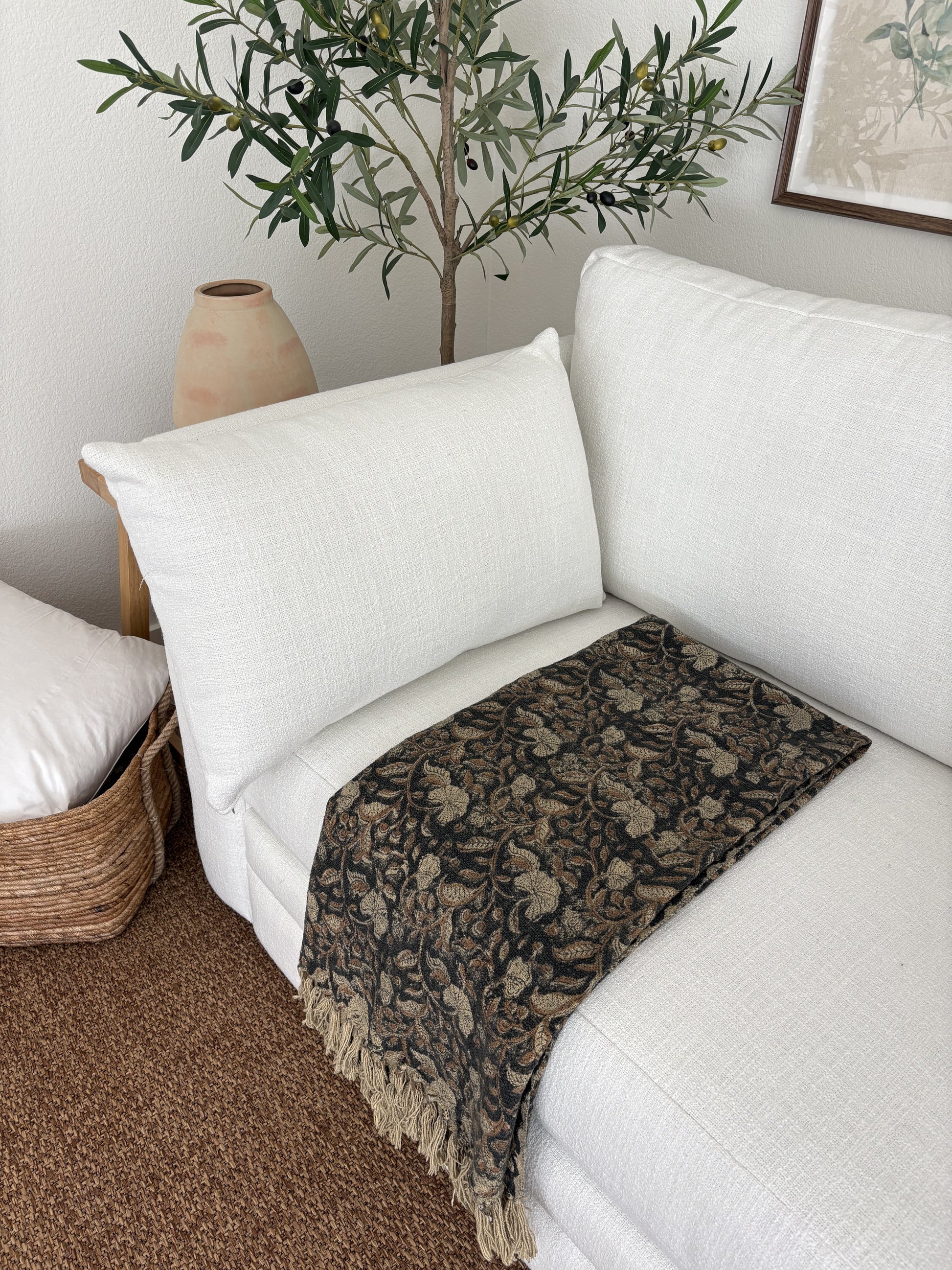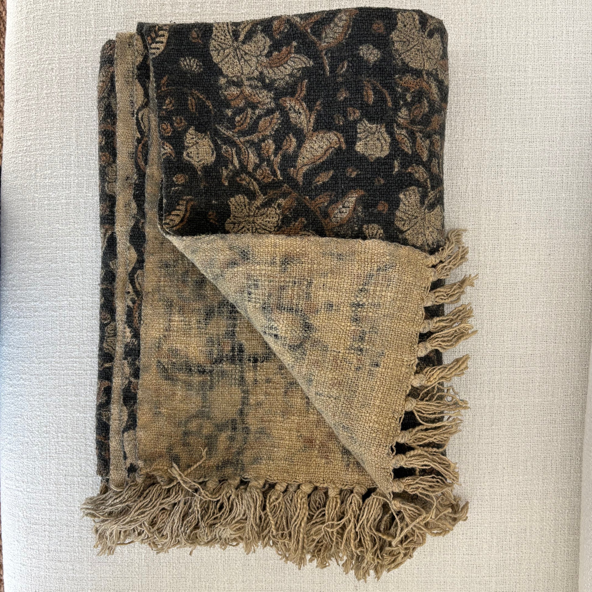 Our beautiful throw blanket features beige and brown flowers on a contrasting black background. This contrasting color combination will elevate your home decor. The throw is made of textured handloomed cotton. These throws have been block printed on using an ancient technique.