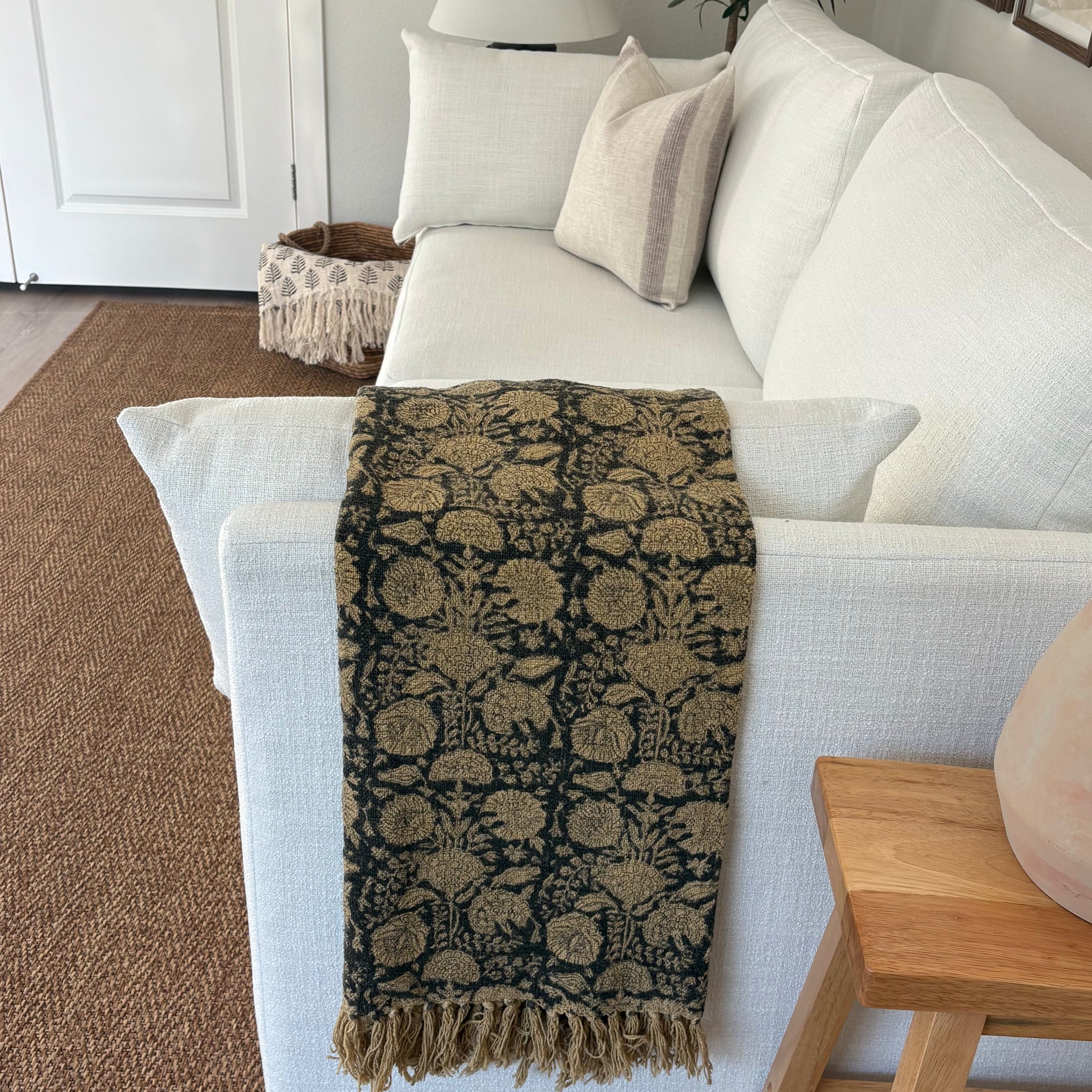 Our beautiful throw blanket features beige and brown flowers on a contrasting black background. This contrasting color combination will elevate your home decor. The throw is made of textured handloomed cotton. These throws have been block printed on using an ancient technique.