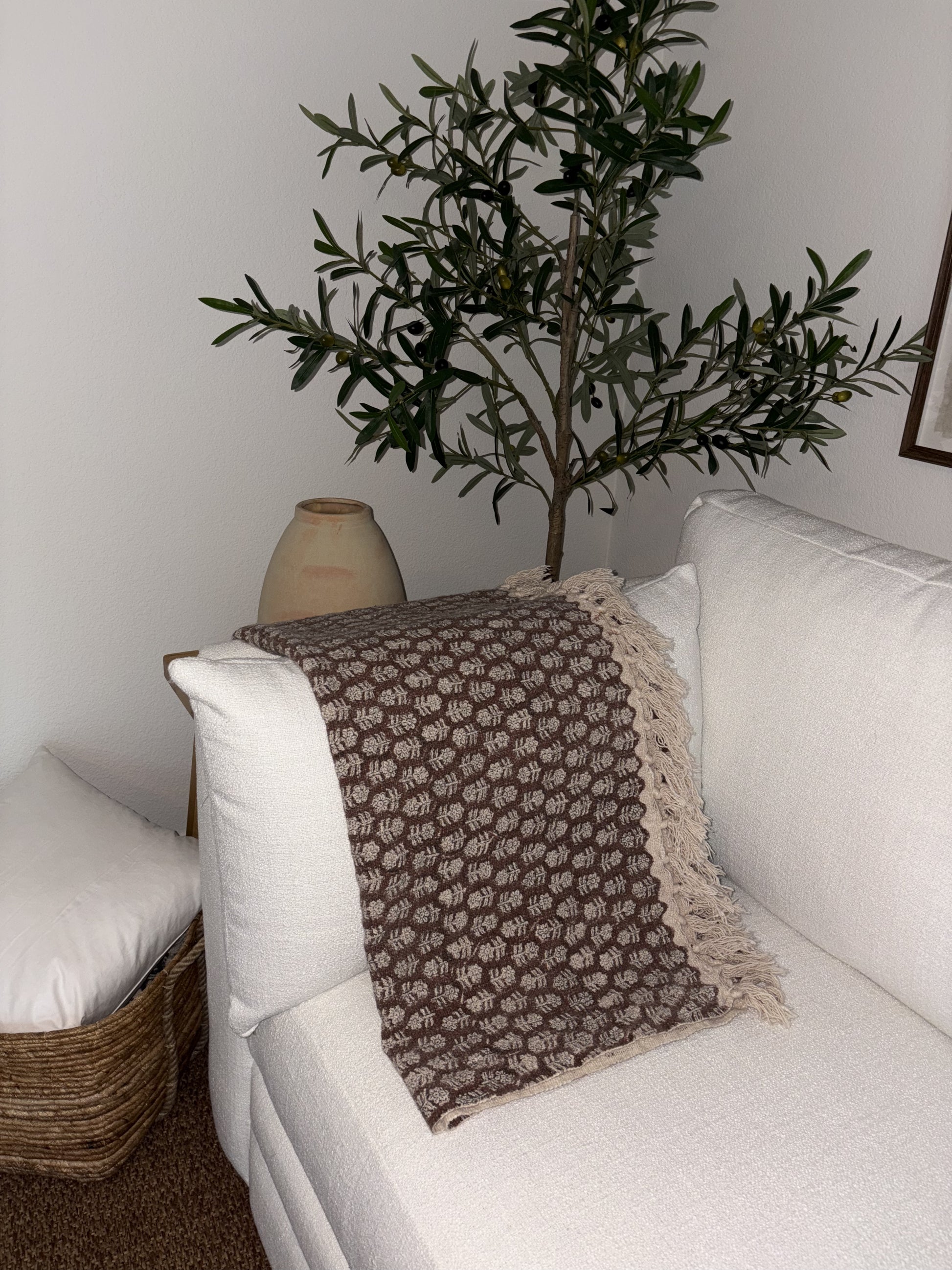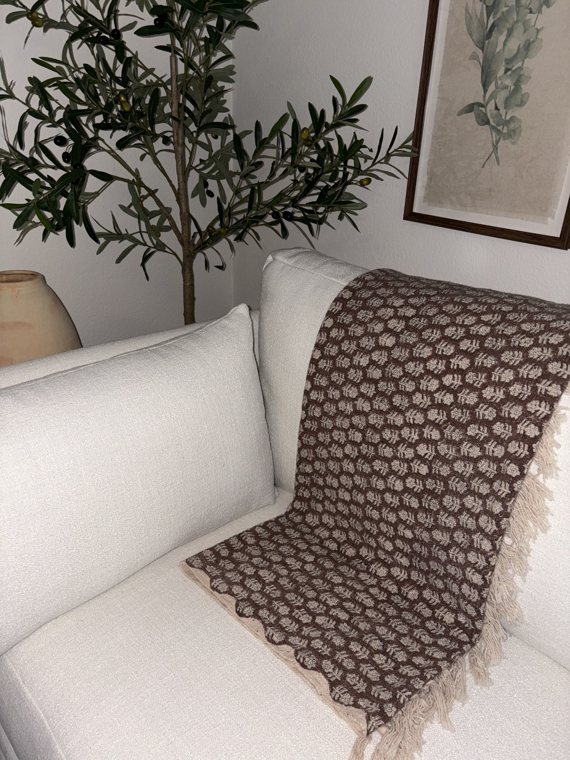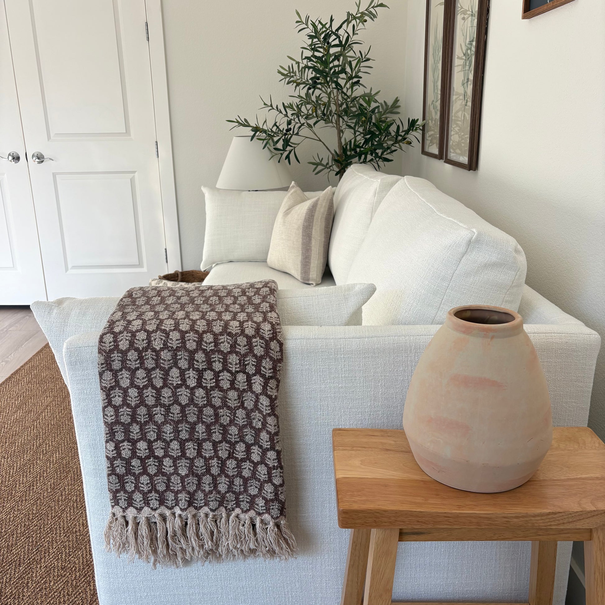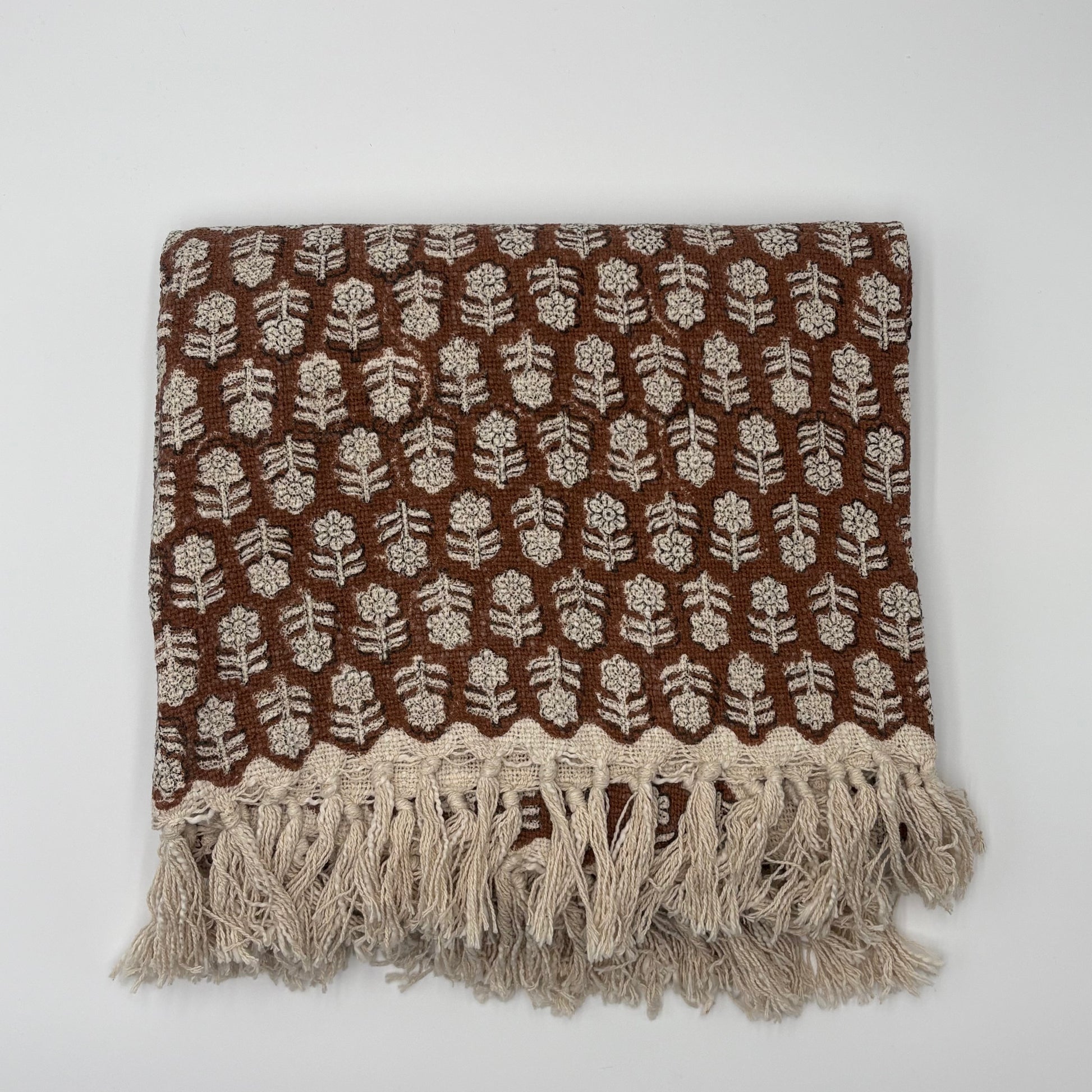 The block print on the linen is entirely done by hand, by master artisans. This is a four-hundred-year-old art form that has been passed down generations and takes an incredible amount of precision and practice to get right. The blocks are carved by artisans, the colors are mixed by a master color artist, and it is then printed on by a block printer. The linen is then air dried and then stitched into throws.