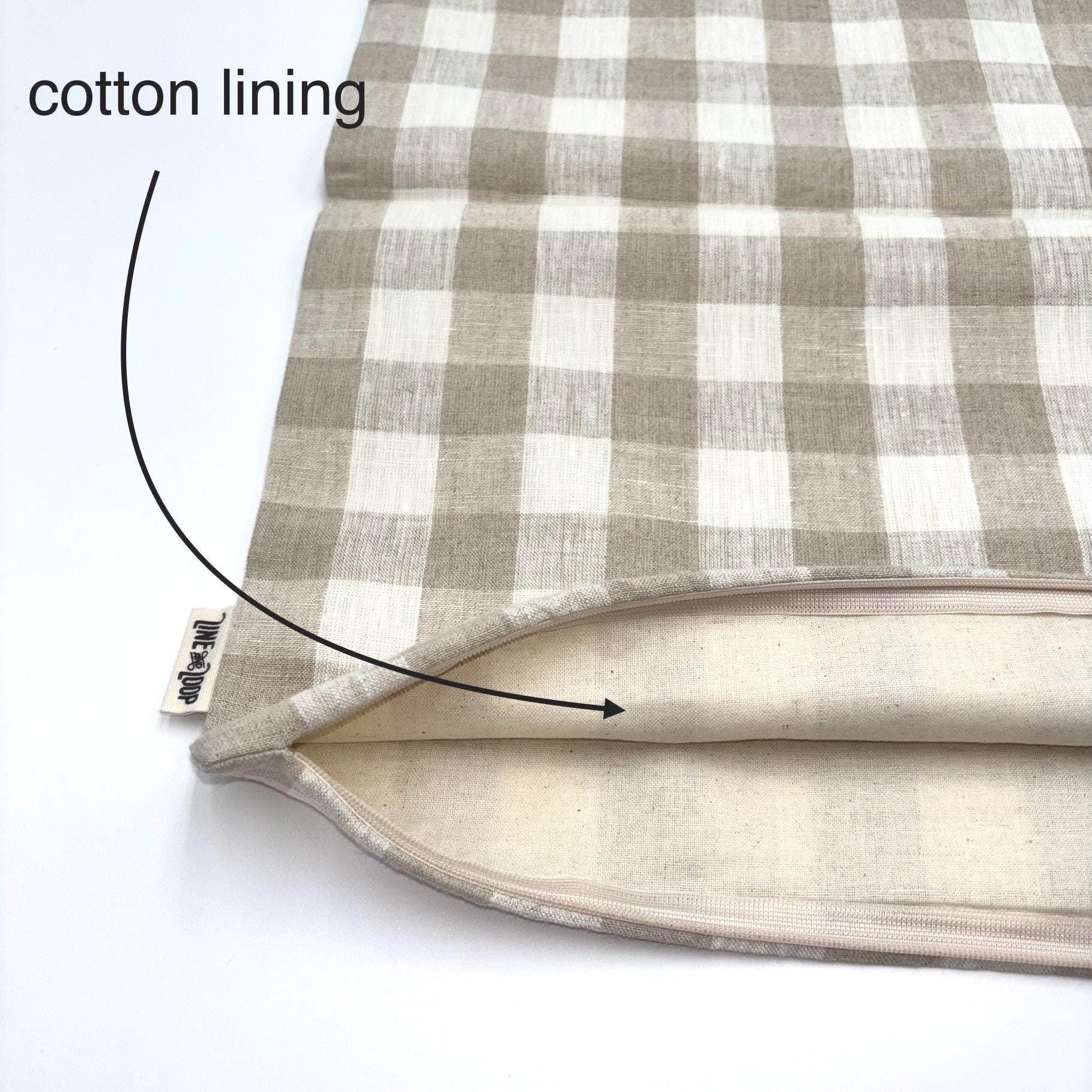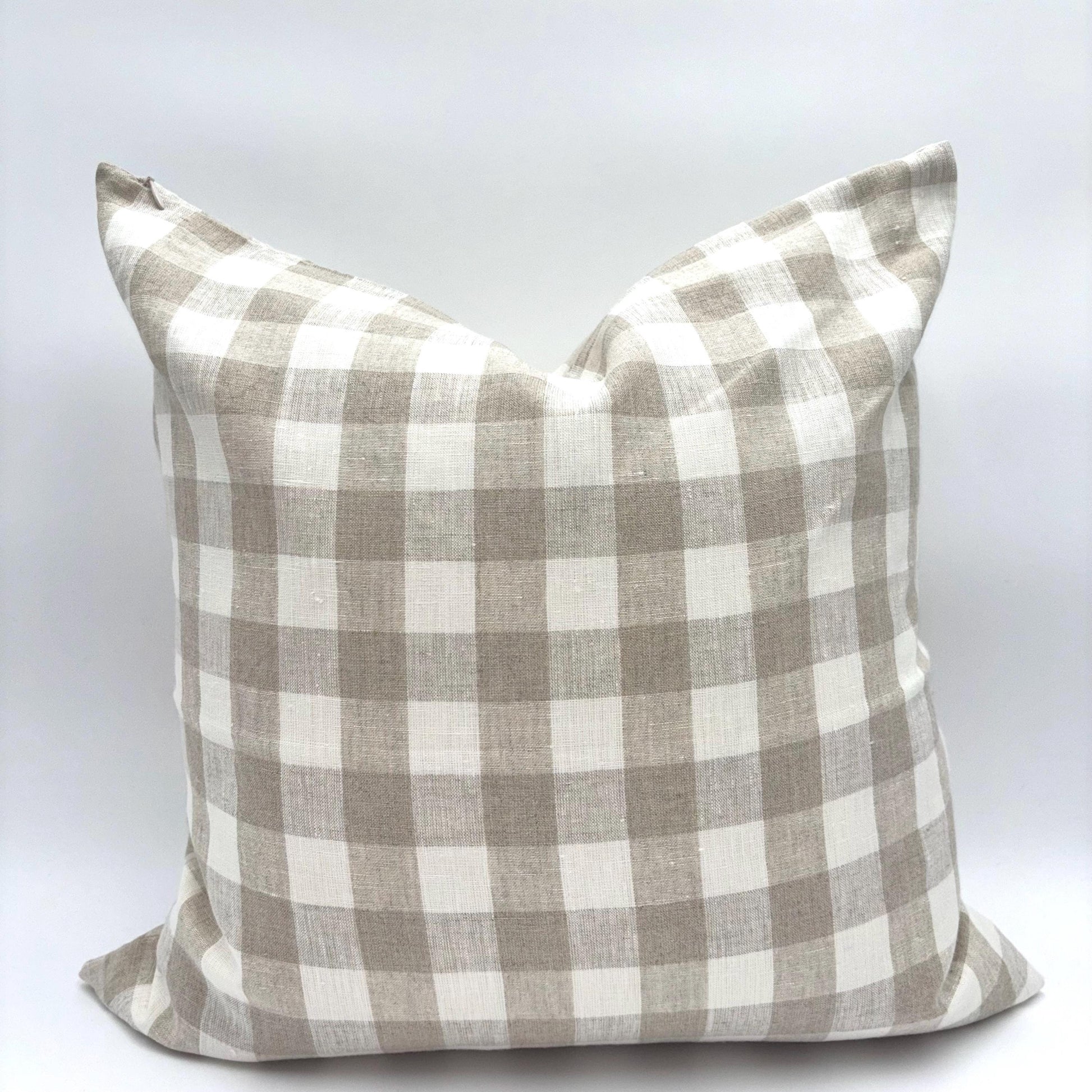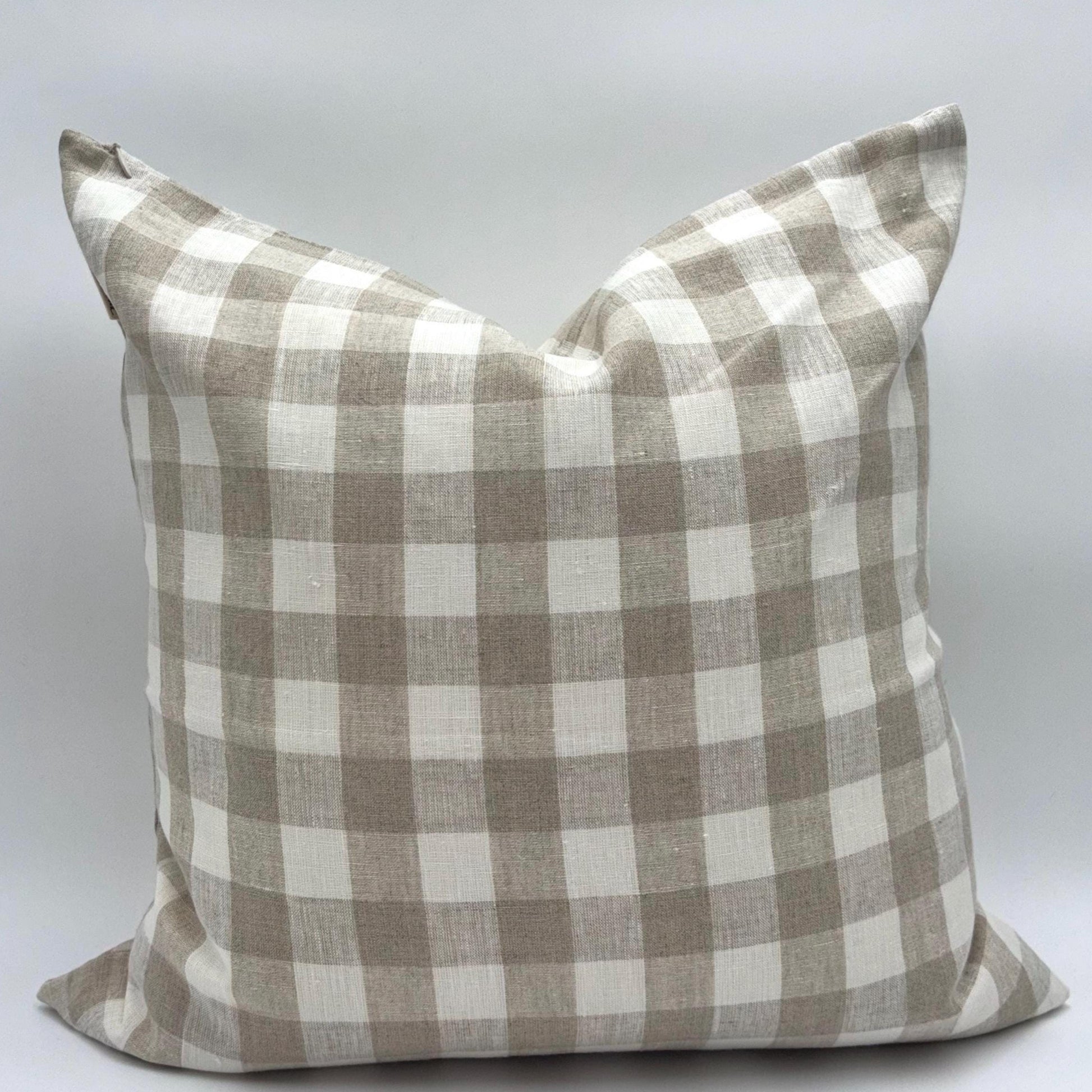 Our "Ella" pillow cover has a gingham pattern with beige and white. The fabric used is yarn dyed linen which is soft and durable. The fabric has been pre-washed to make it softer and avoid shrinkage. The front and the back are made of 100% linen. The inside of the pillow cover has an additional cotton lining to make the pillow cover even more durable.