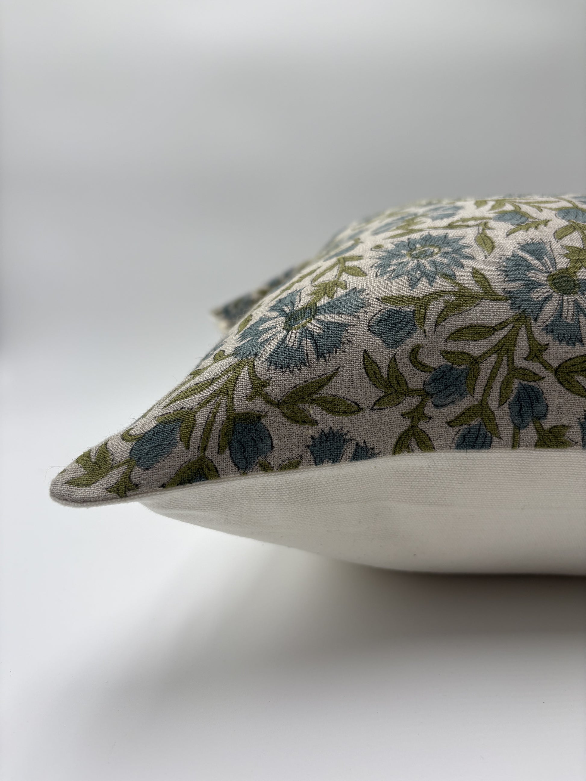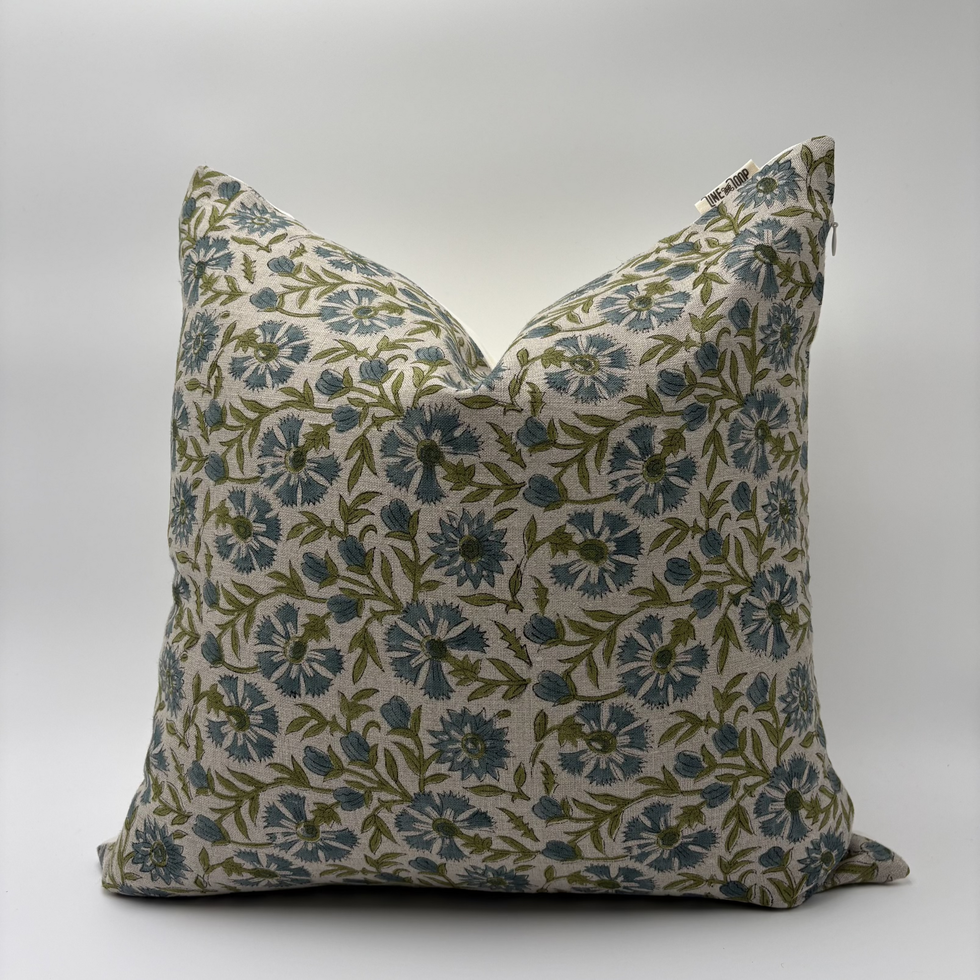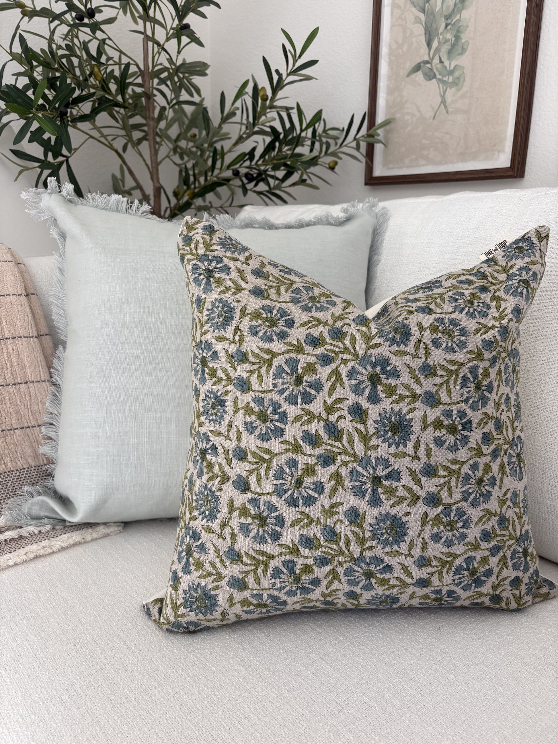 Our "Kaya" pillow cover features beautiful blue flowers and green vines on an oatmeal background. This beautiful color palette screams spring and goes well with blue, green and beige pillow covers.