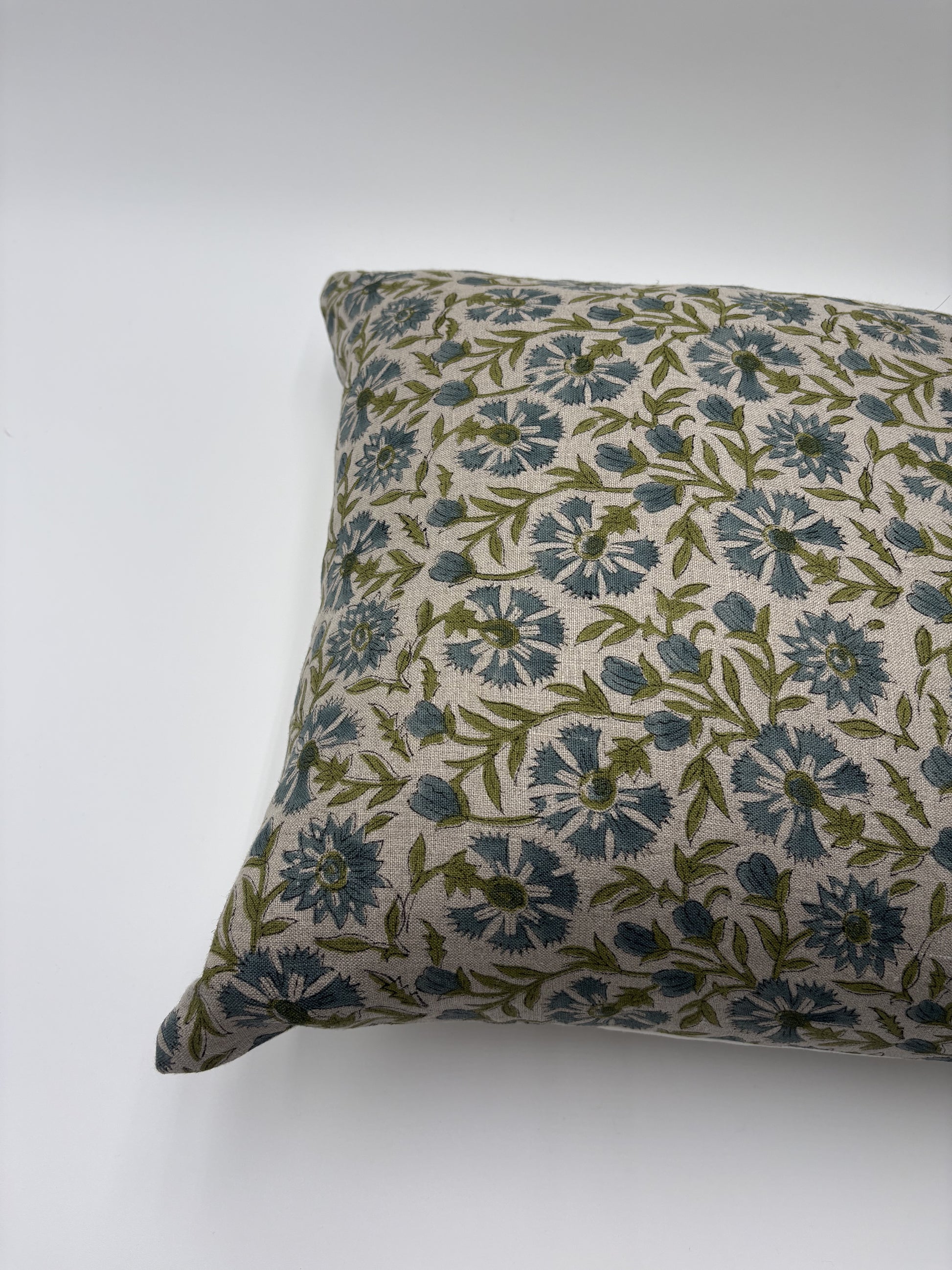 The block print on the linen is entirely done by hand, by master artisans. This is a four-hundred-year-old art form that has been passed down generations and takes an incredible amount of precision and practice to get right. The blocks are carved by artisans, the colors are mixed by a master color artist, and it is then printed on by a block printer. The linen is then air dried and then stitched into cushion covers.