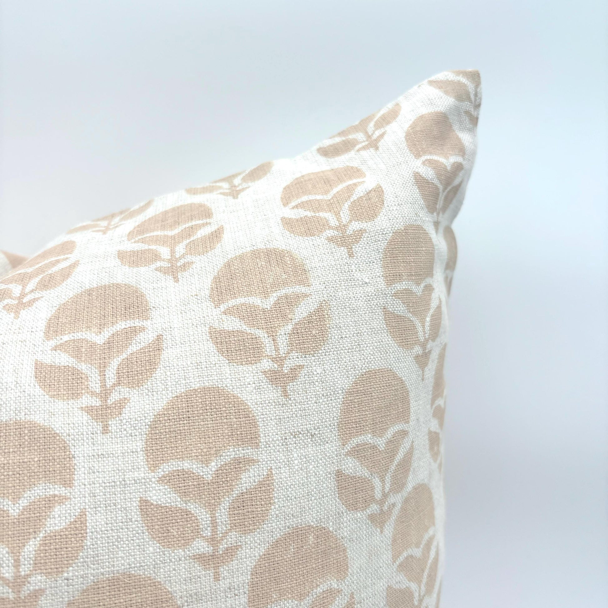 The block print on the linen is entirely done by hand, by master artisans. This is a four-hundred-year-old art form that has been passed down generations and takes an incredible amount of precision and practice to get right. The blocks are carved by artisans, the colors are mixed by a master color artist, and it is then printed on by a block printer. The linen is then air dried and then stitched into pillow covers.