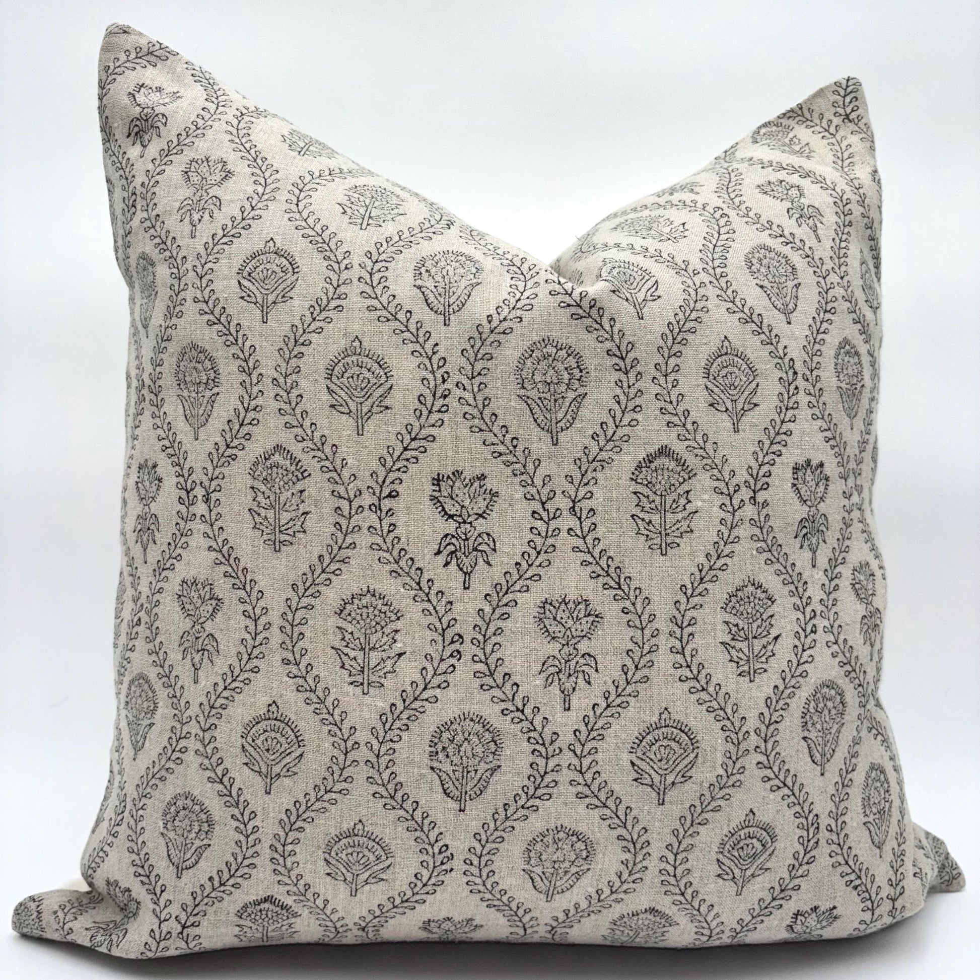 The block print on the linen is entirely done by hand, by master artisans. This is a four-hundred-year-old art form that has been passed down generations and takes an incredible amount of precision and practice to get right. The blocks are carved by artisans, the colors are mixed by a master color artist, and it is then printed on by a block printer. The linen is then air dried and then stitched into cushion covers.