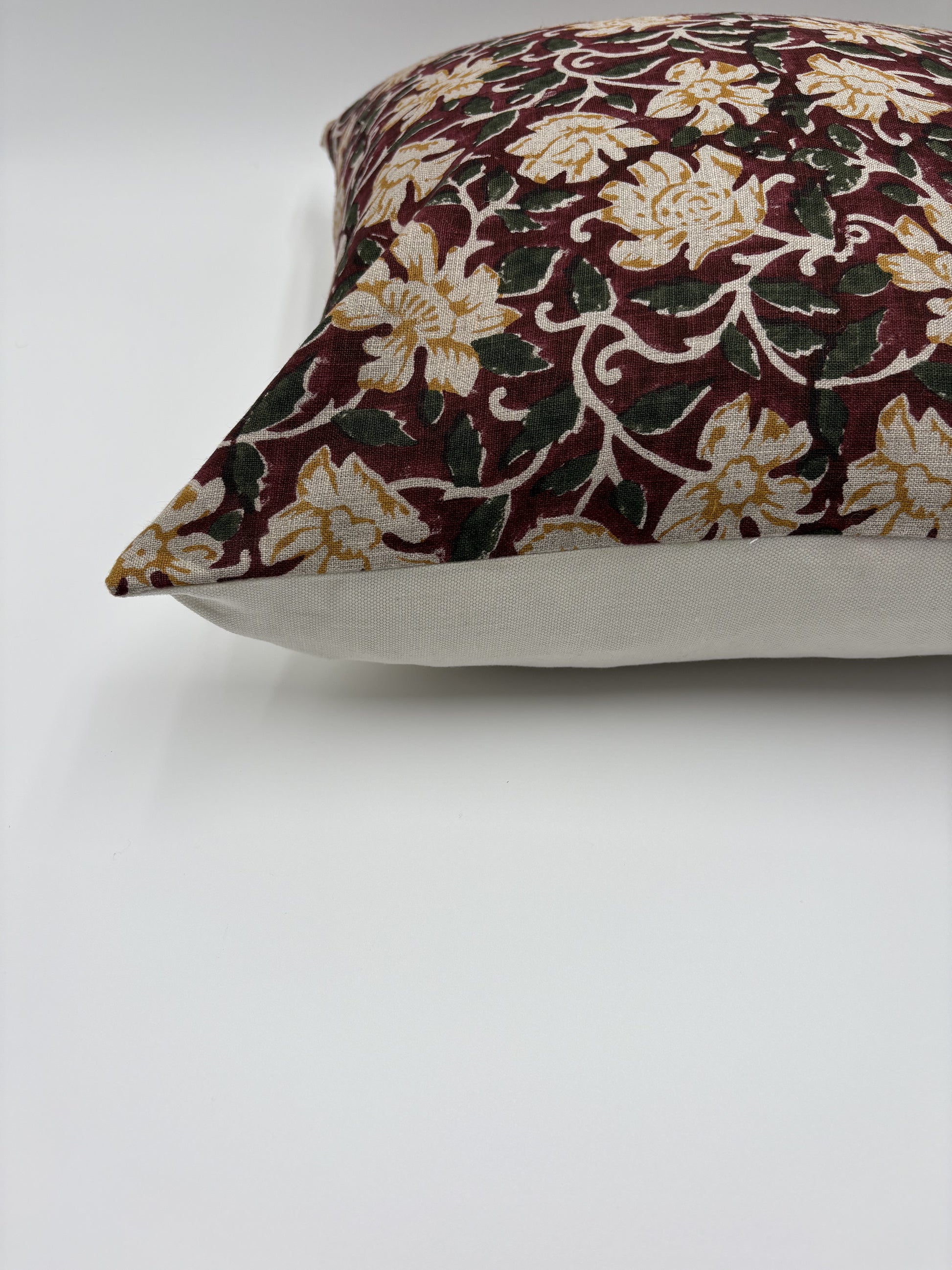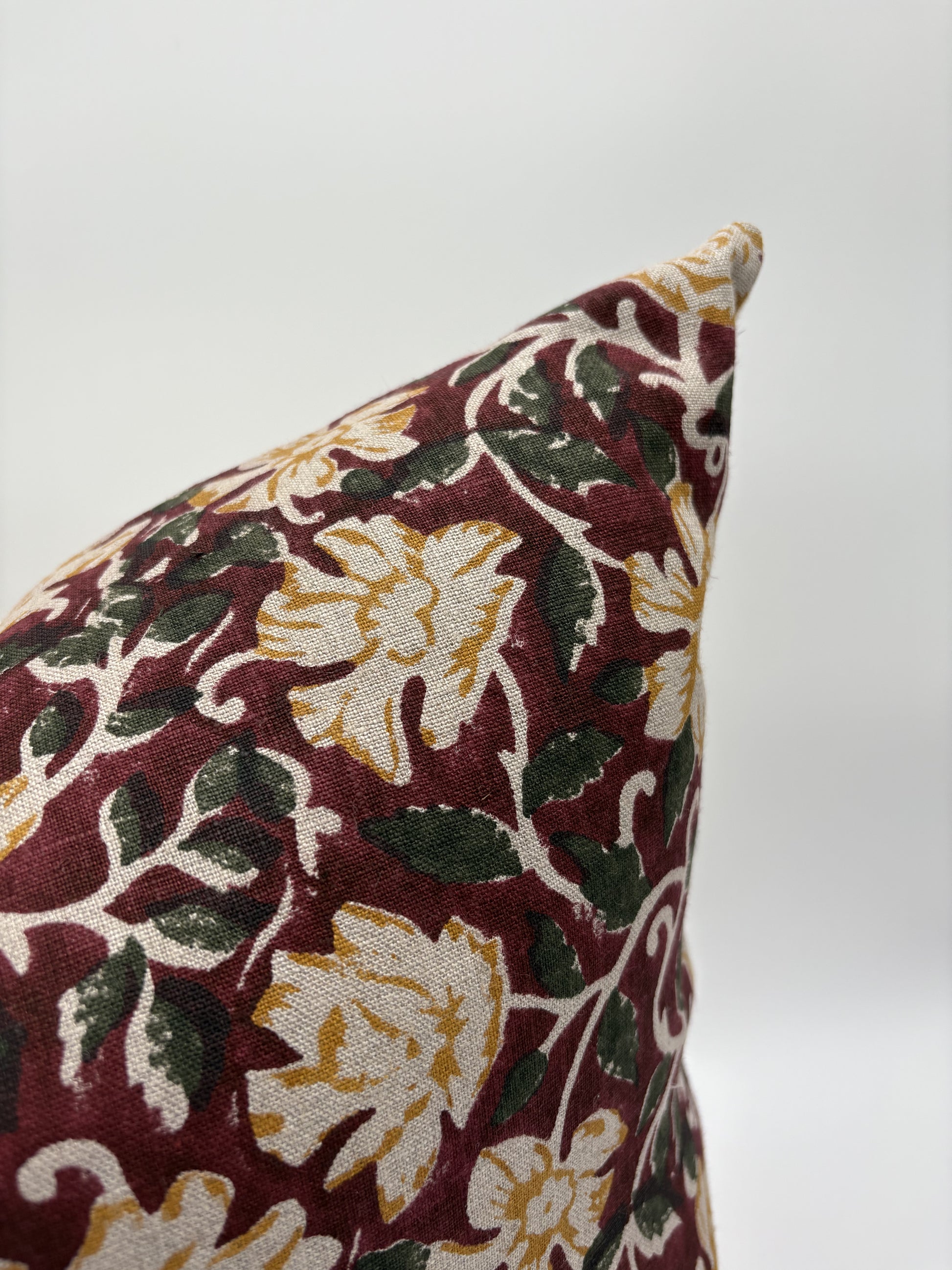 Our "Flora" pillow cover features a floral pattern with yellow flowers and green stems on a deep cranberry red background. This festive color palette screams Christmas and goes well with green and beige pillows.