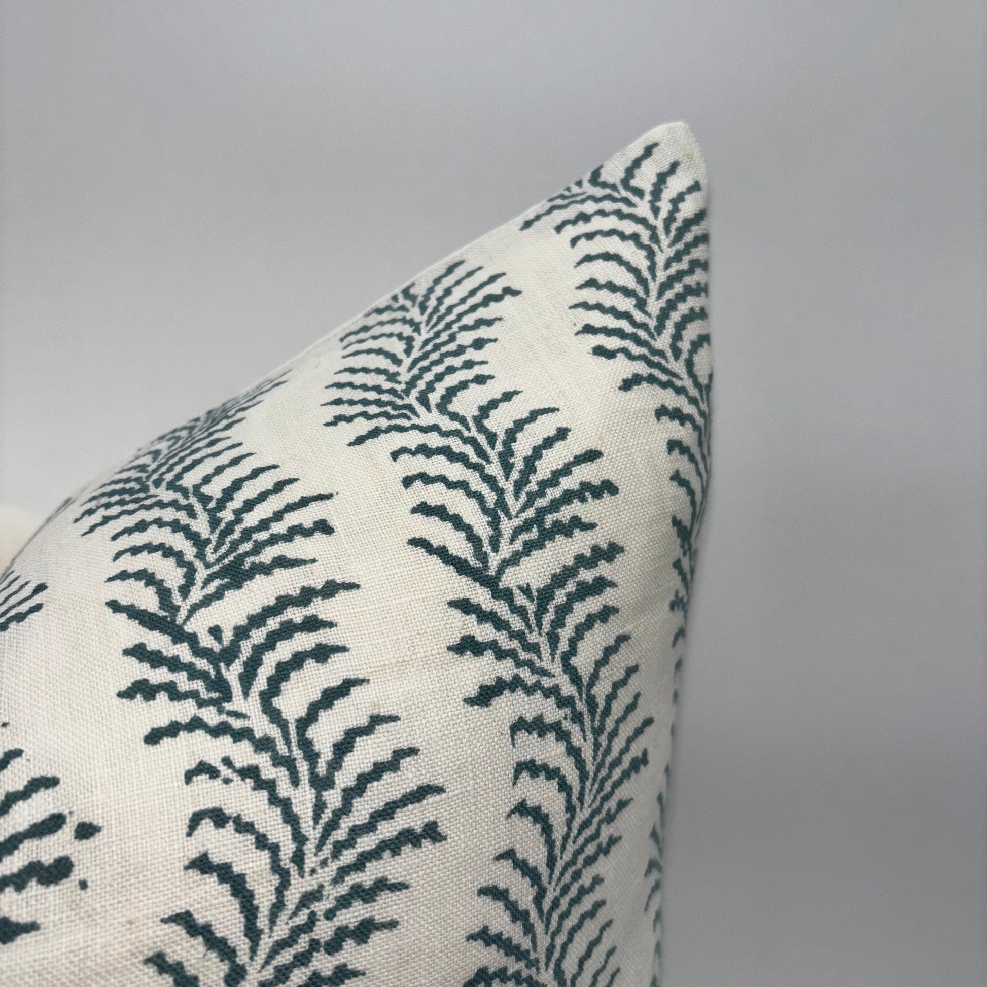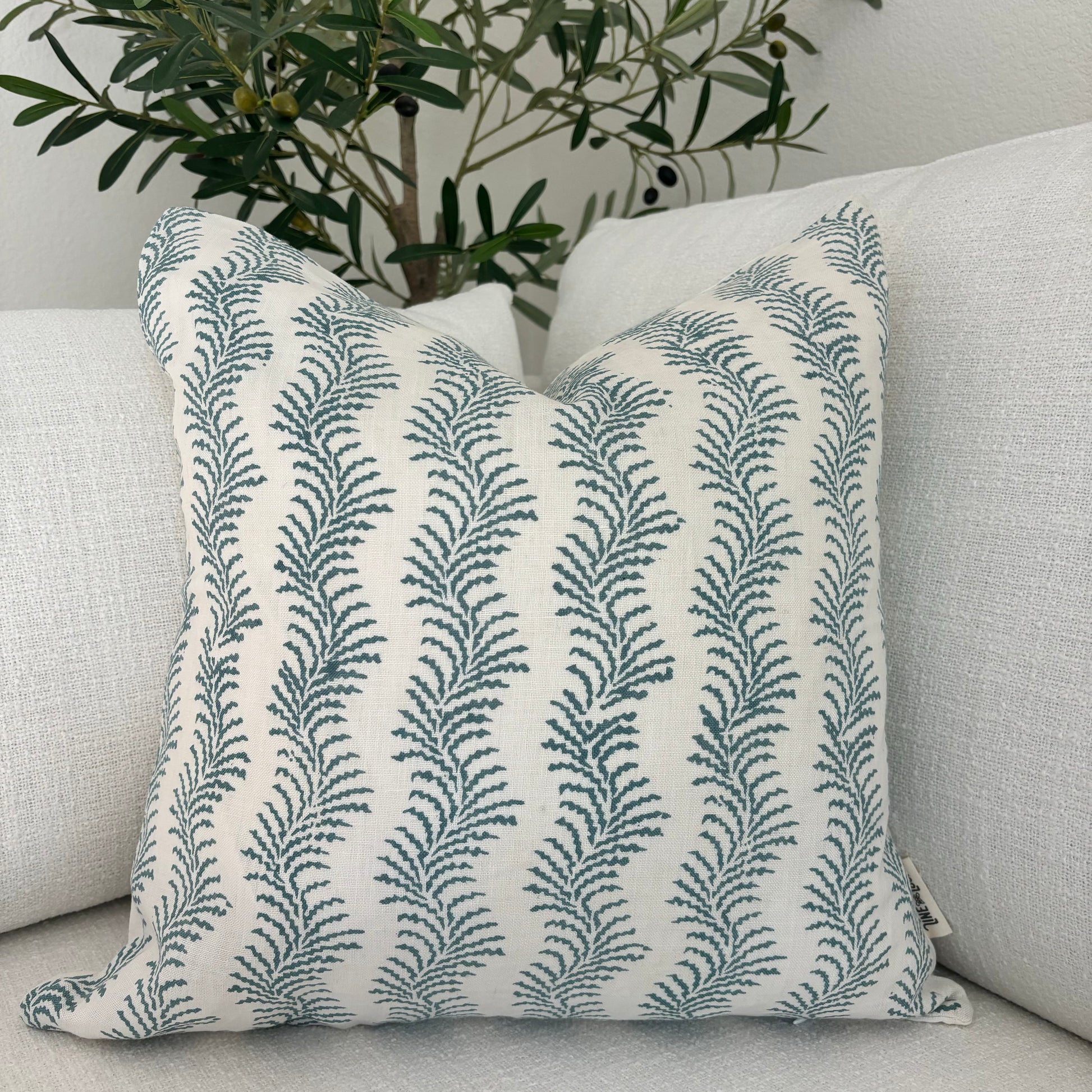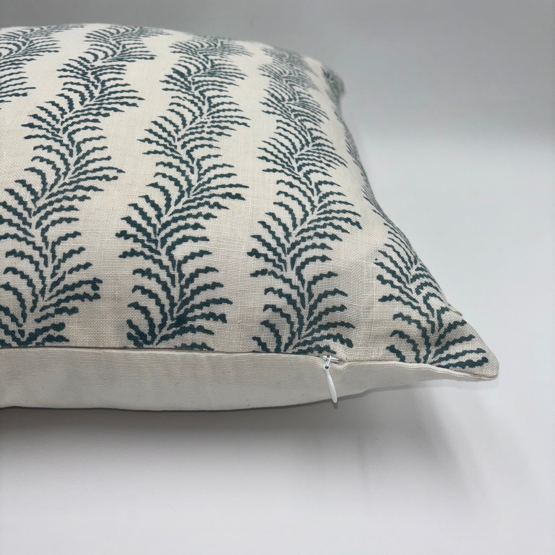 Our "Alia" pillow cover features beautiful turquoise blue ferns on a soft white background. This color palette pairs well with blues, greens and whites.