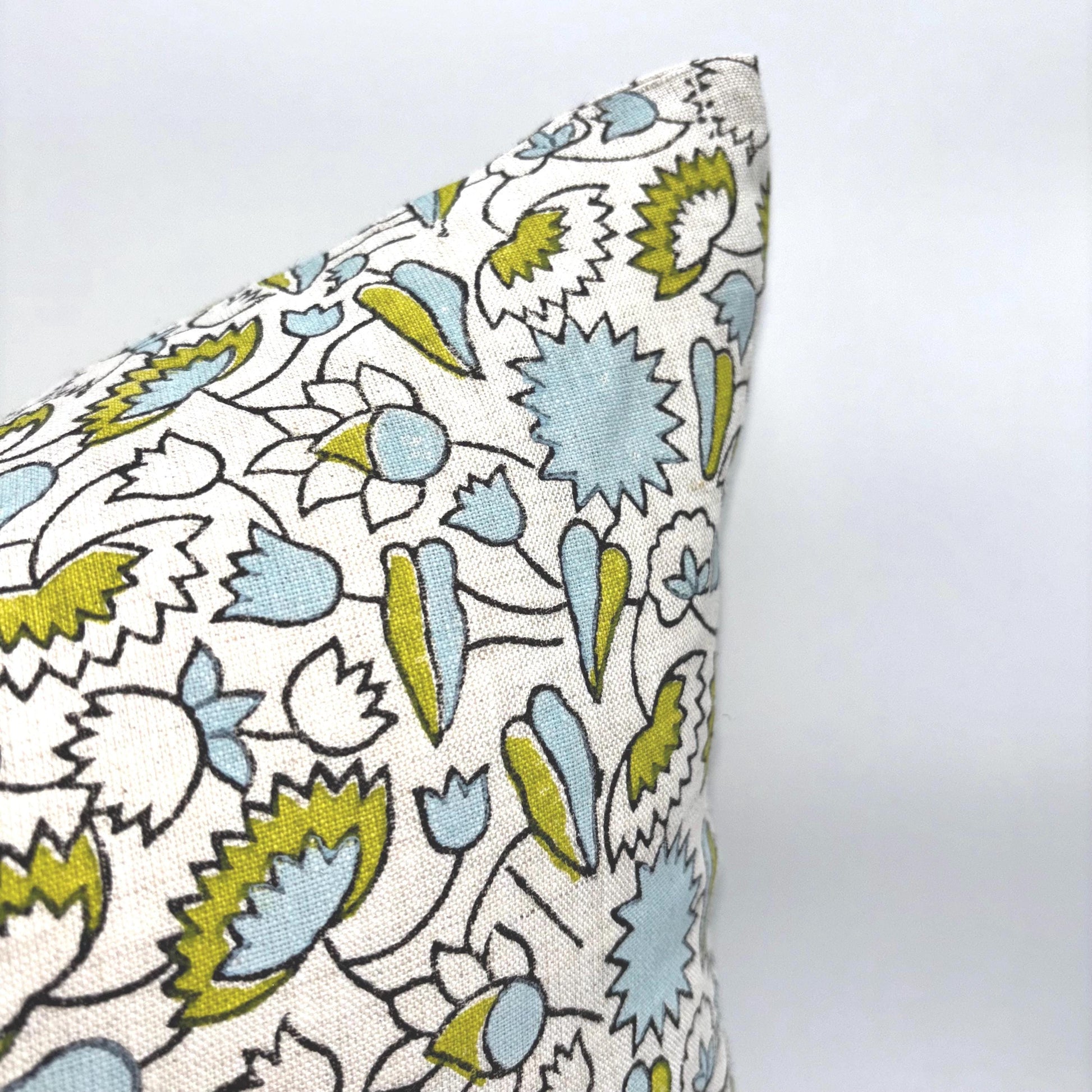Charlotte - hand block printed linen pillow cover (green, blue)