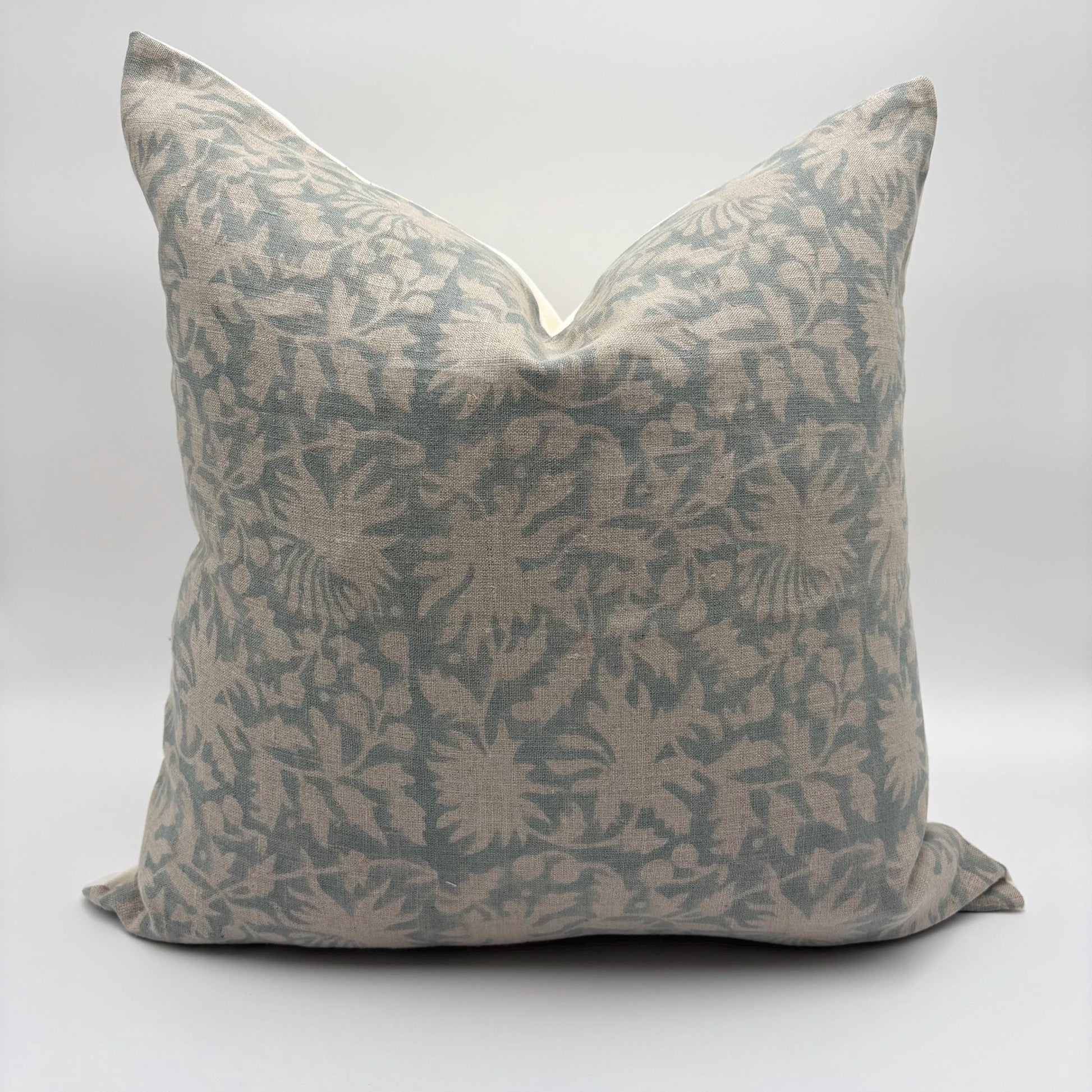 The block print on the linen is entirely done by hand, by master artisans. This is a four-hundred-year-old art form that has been passed down generations and takes an incredible amount of precision and practice to get right. The blocks are carved by artisans, the colors are mixed by a master color artist, and it is then printed on by a block printer. The linen is then air dried and then stitched into cushion covers.