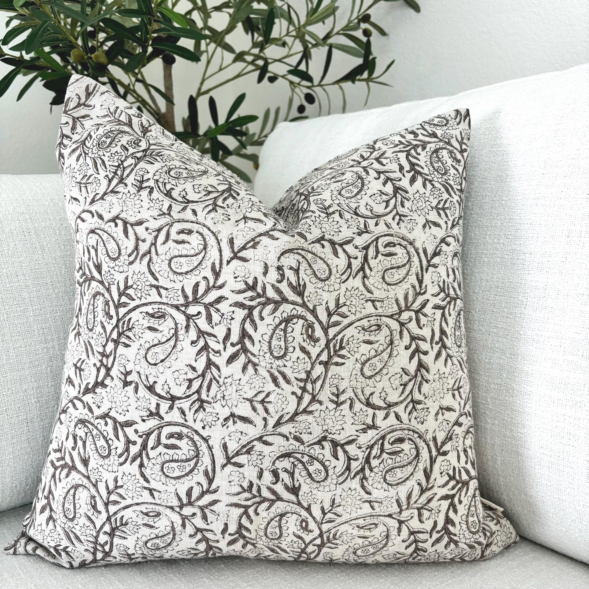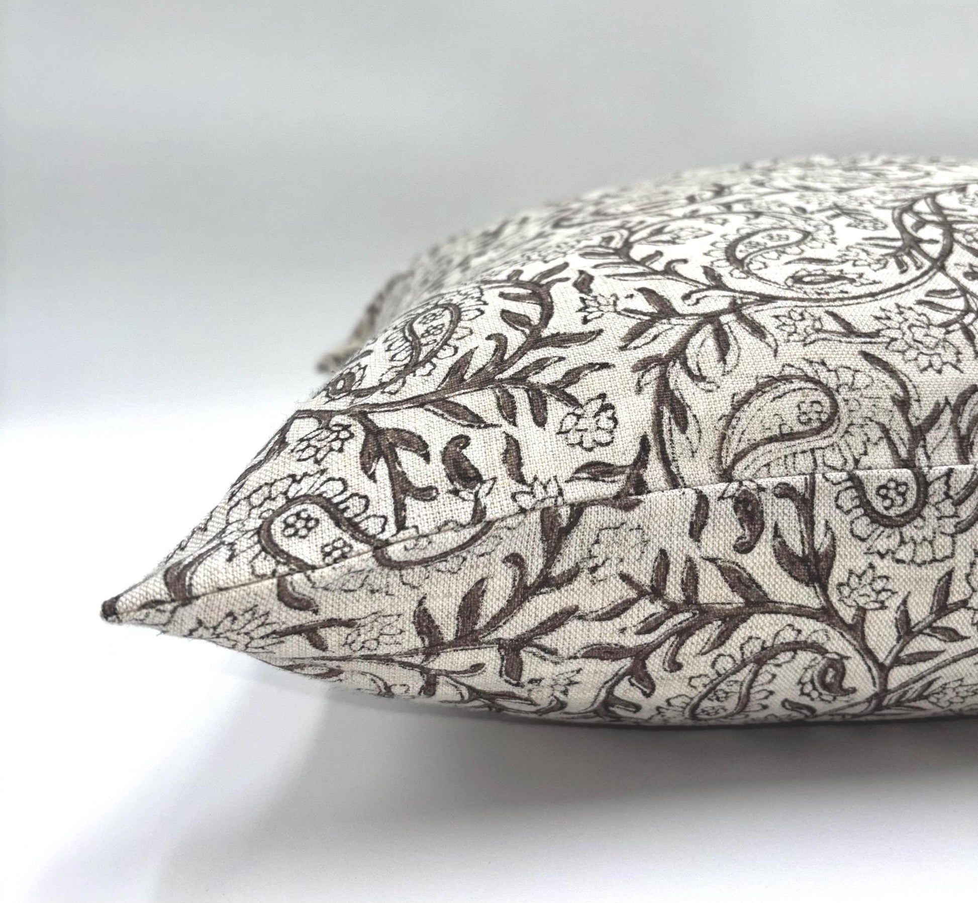 Our "Lina" pillow cover features earthy-brown colored flowers and vines on a light oatmeal-colored background. This delicate pattern pairs well with oatmeal-colored, brown, gray and white pillows.