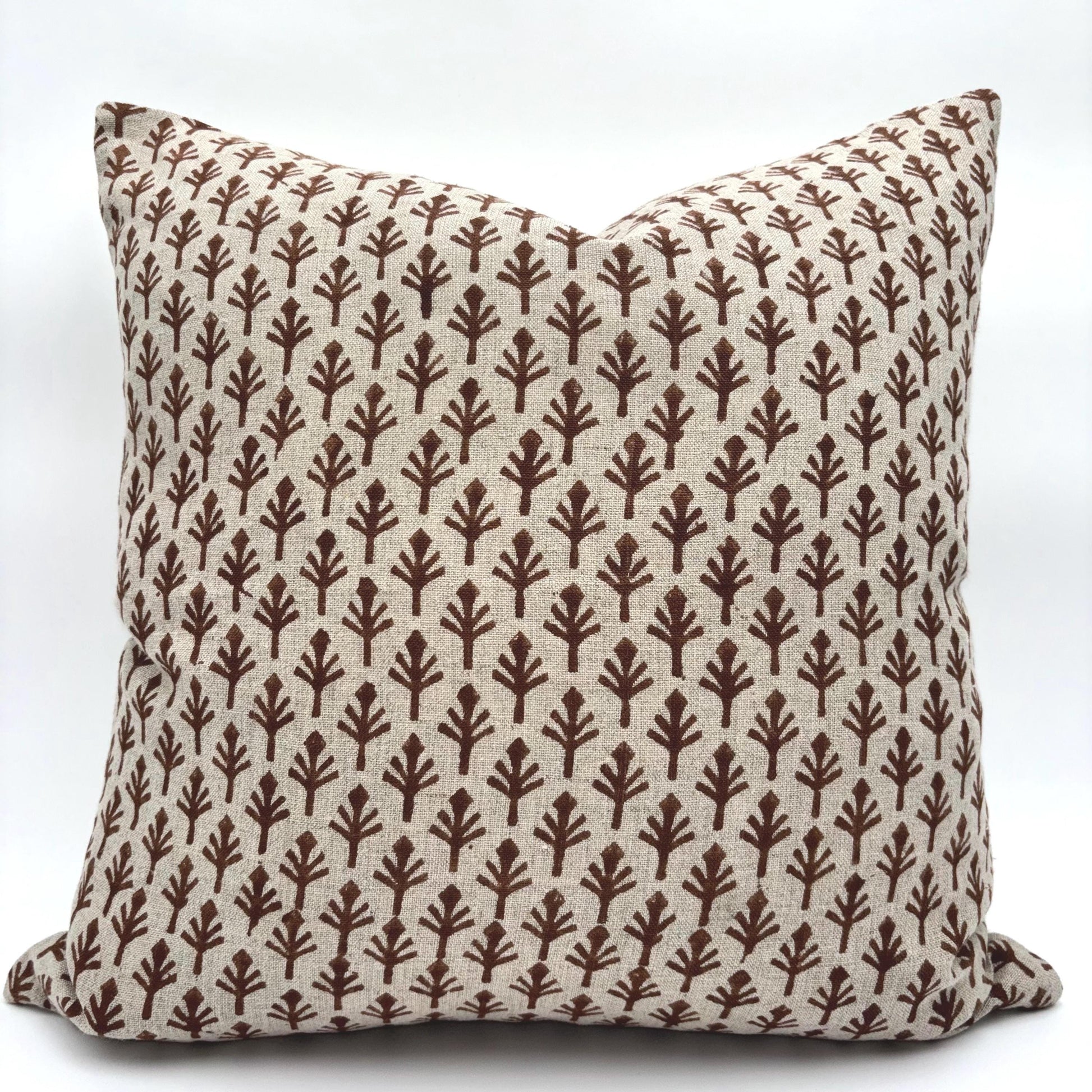 Our "Cooper" pillow cover has a brown pine tree pattern on a light oatmeal beige background. This neutral color palette goes well with brown and beige pillows.