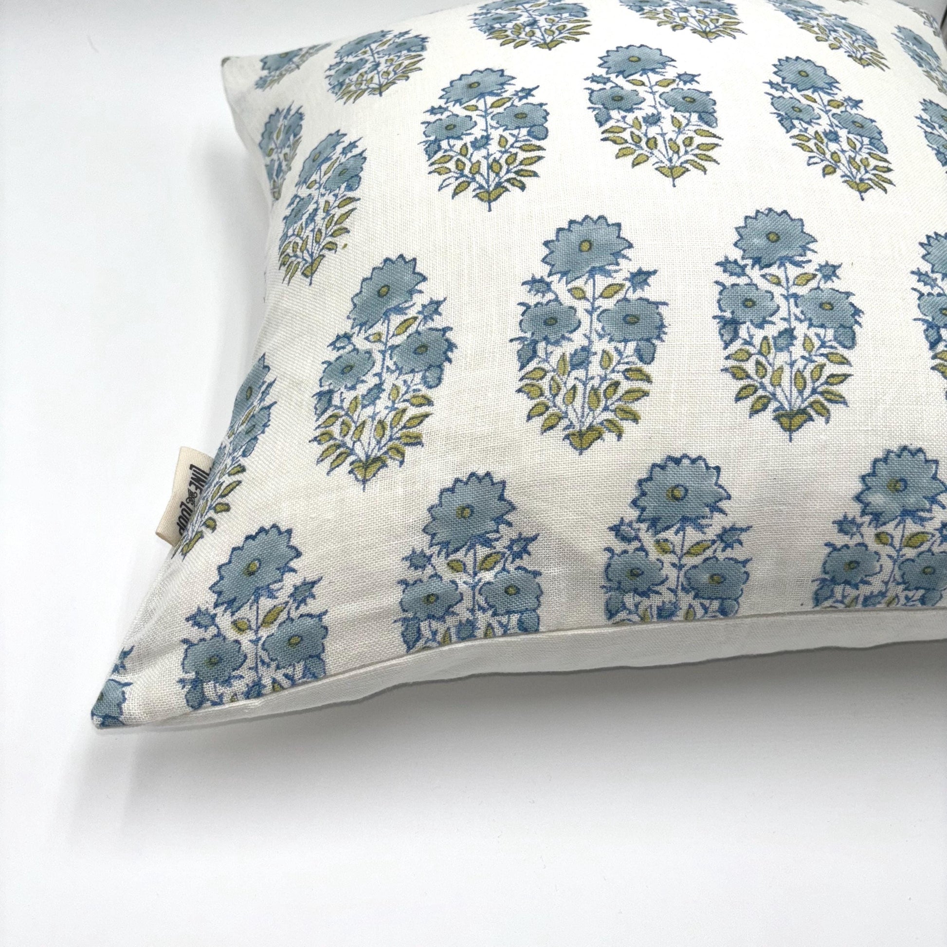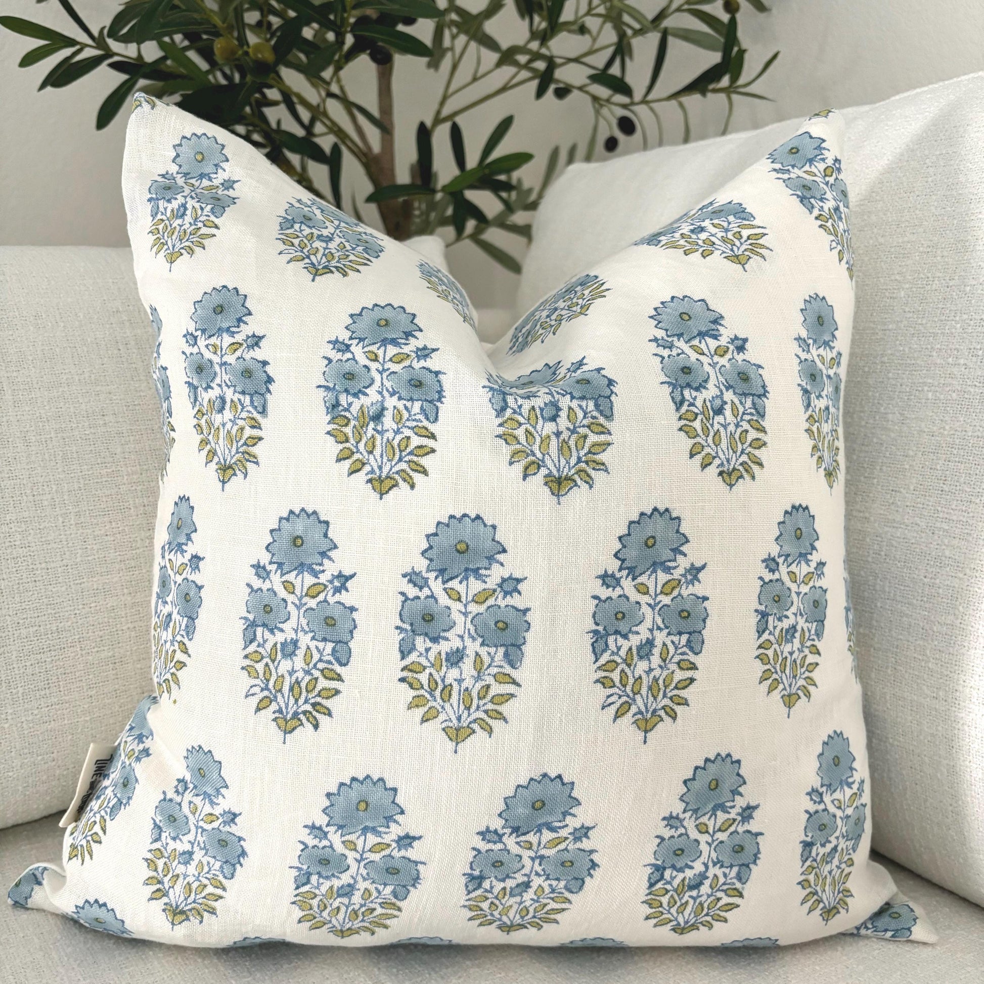 Our "Addison" pillow cover features light blue bouquet of flowers on a soft white background. This calming color palette goes well with blue, white and green cushions