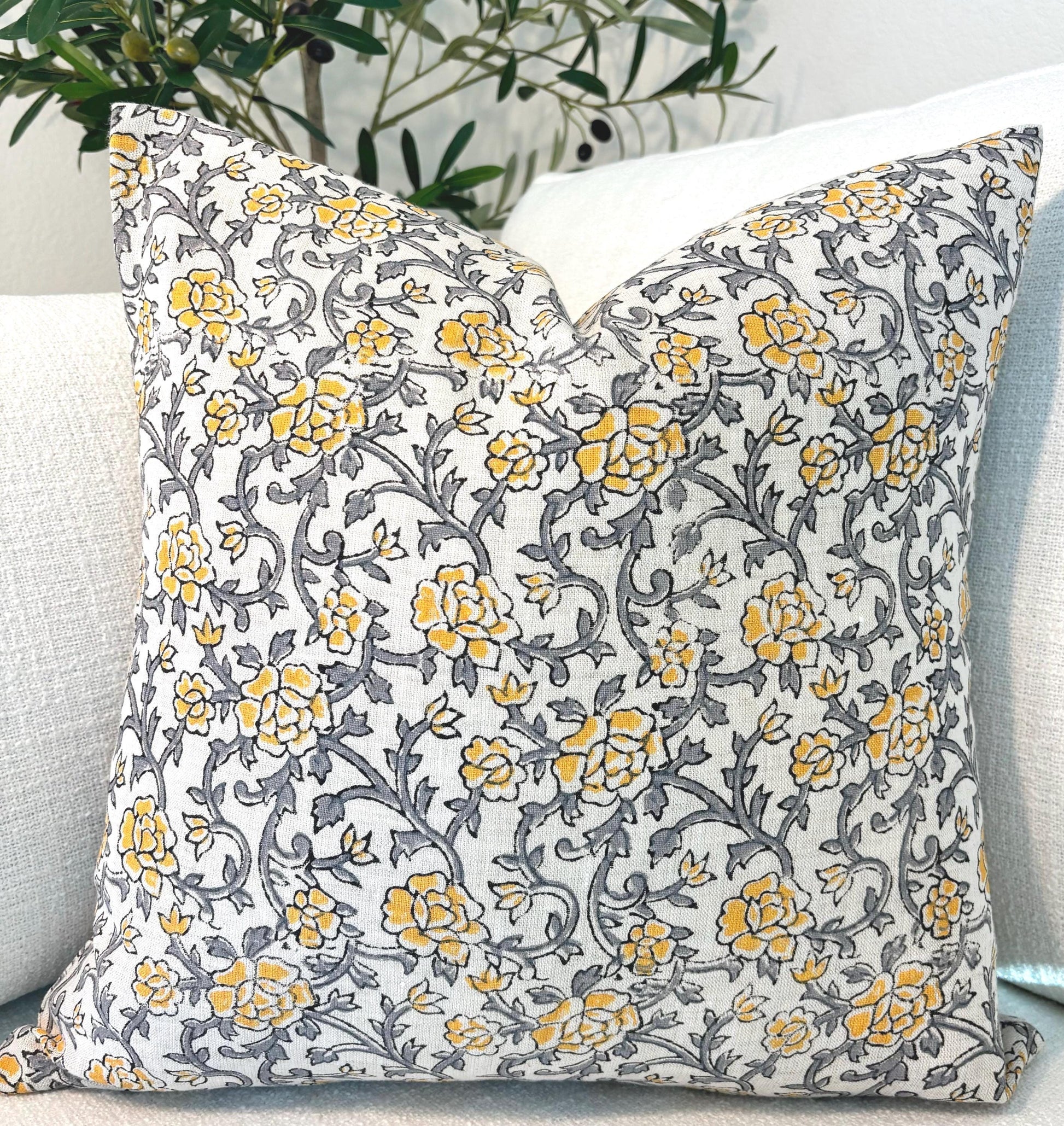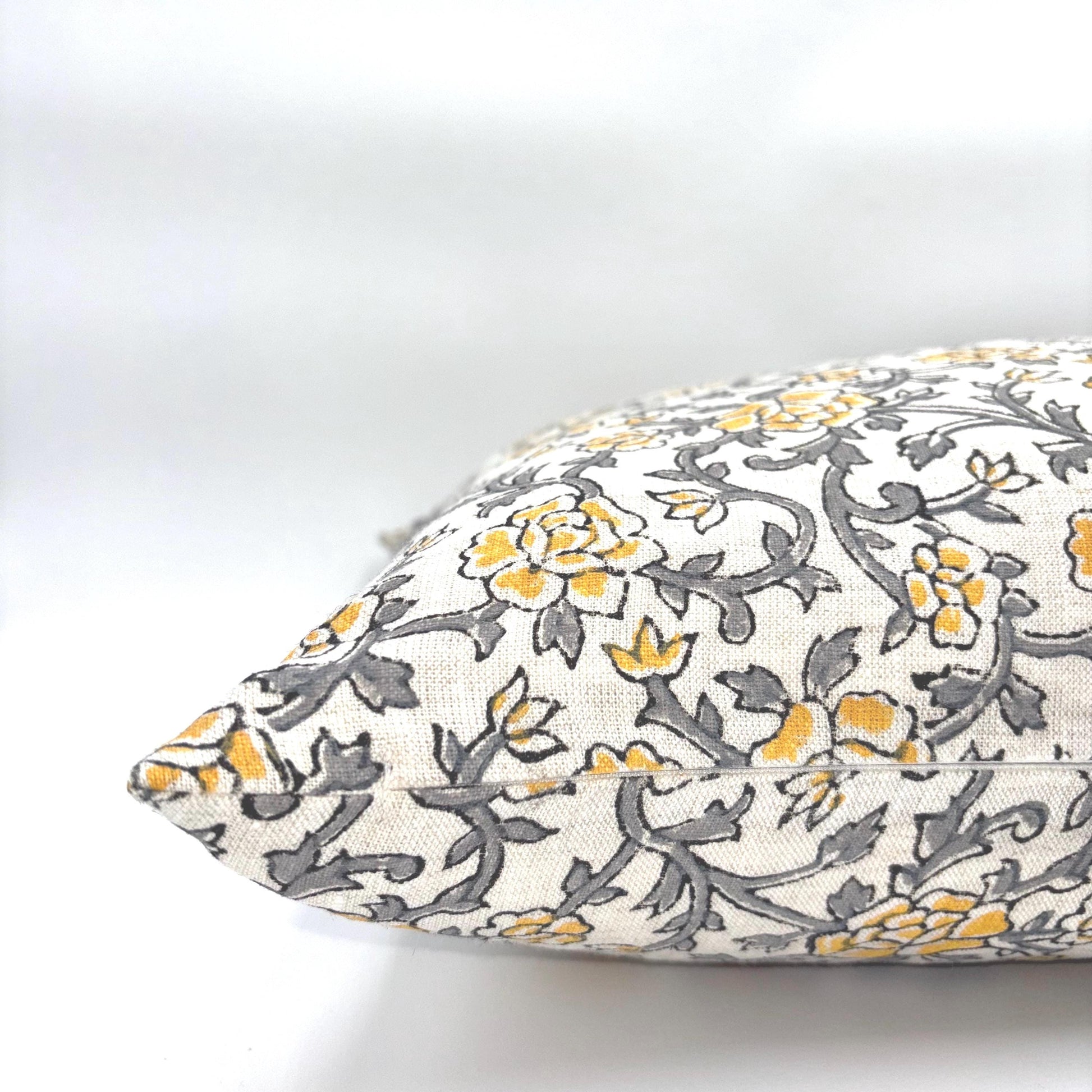Rose - hand block printed linen pillow cover (gray, yellow)