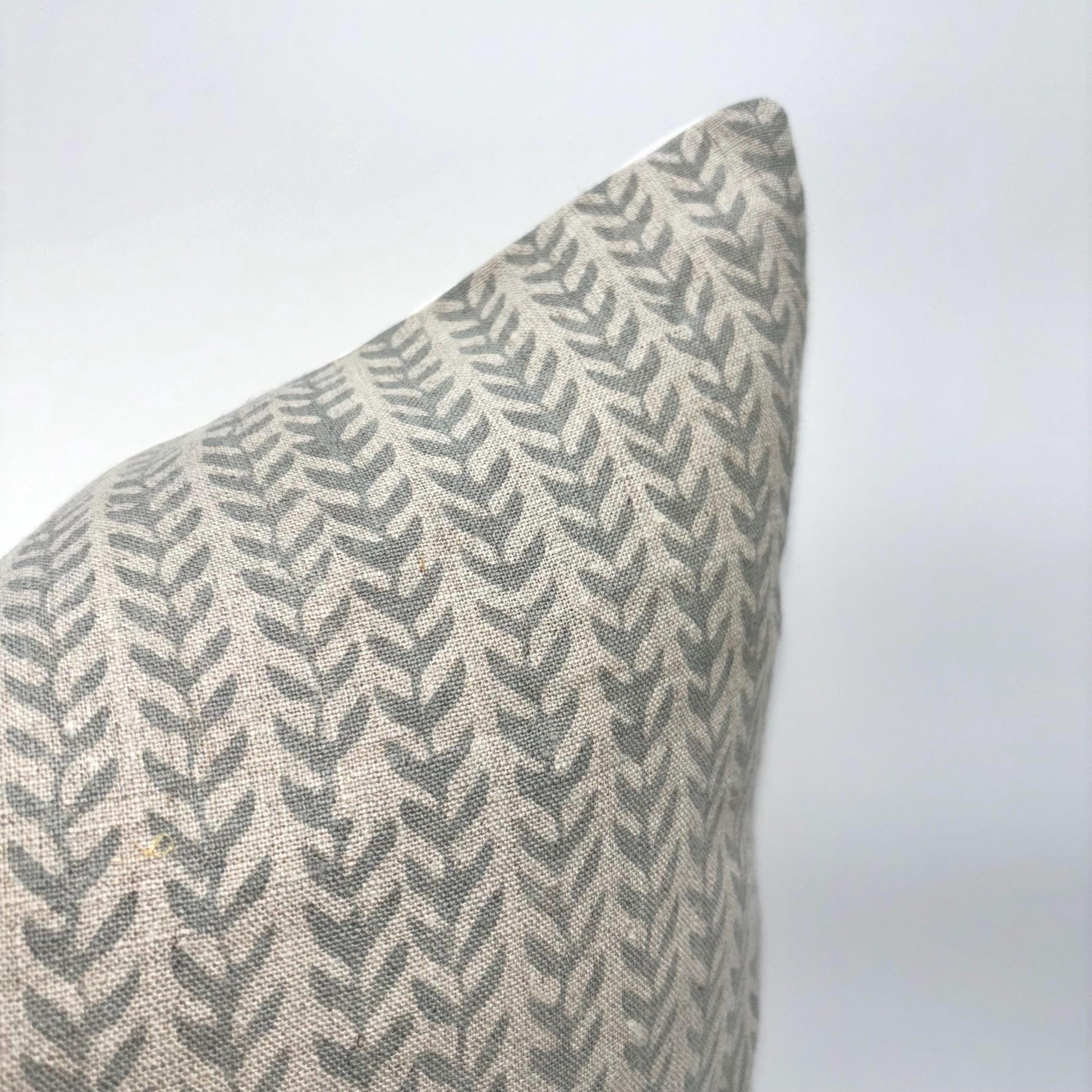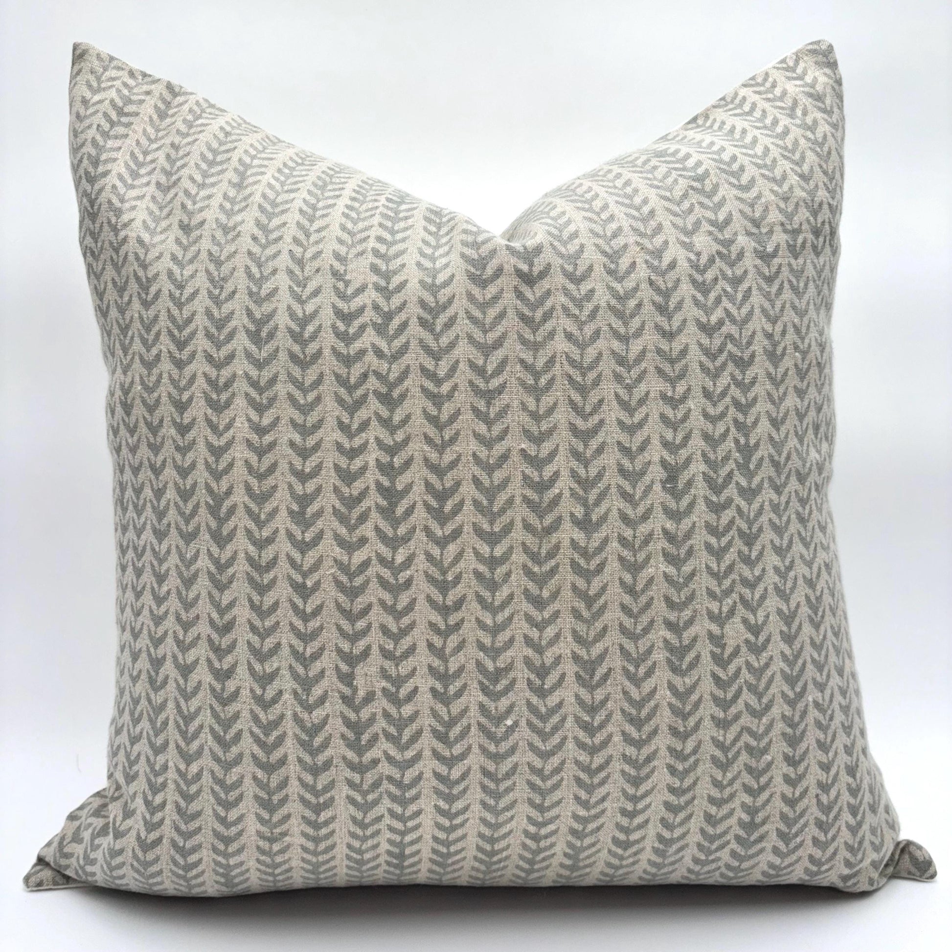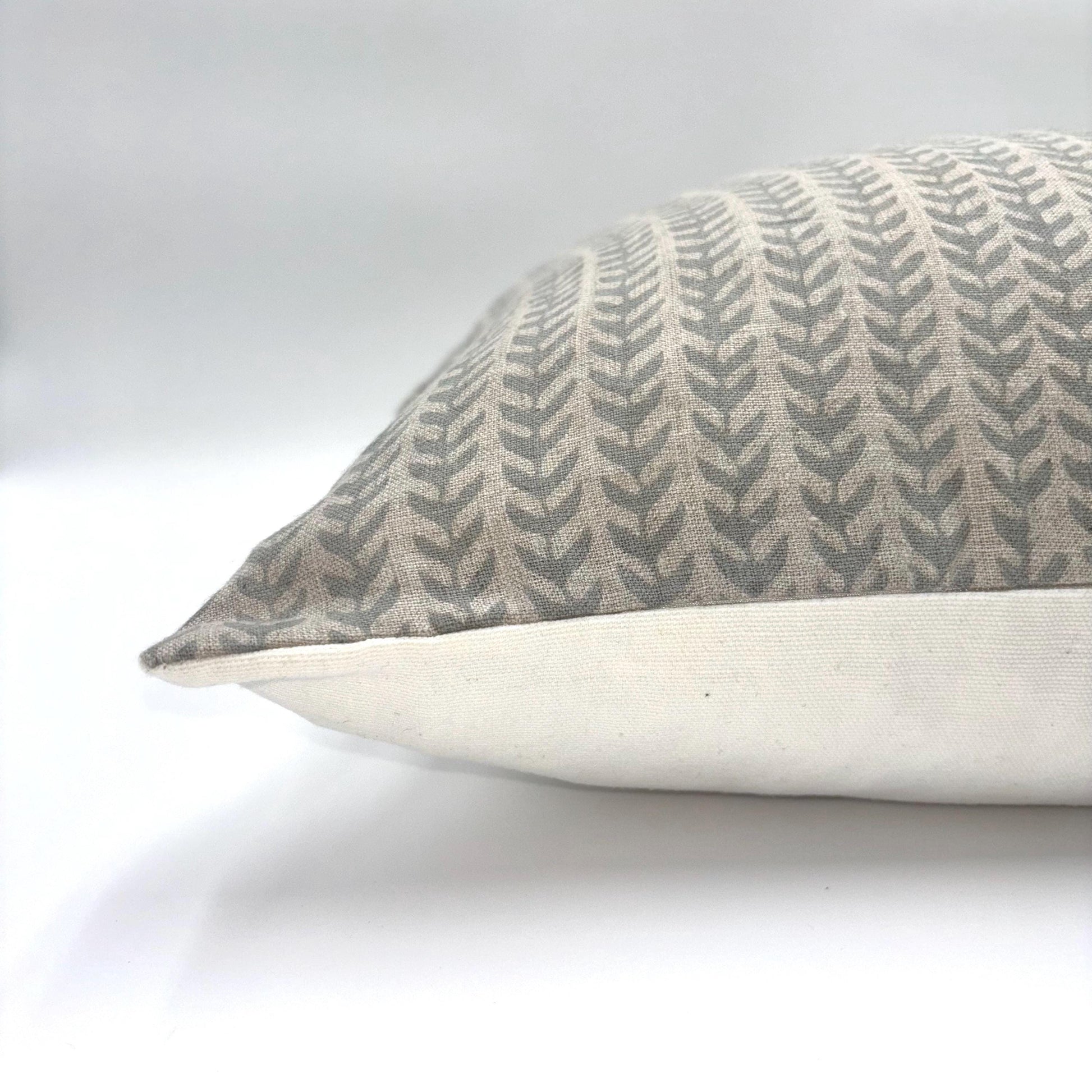 Our "Alba" pillow cover has a simple yet beautiful gray vine pattern on an oatmeal-colored background. This neutral color palette goes well with gray and beige pillows.