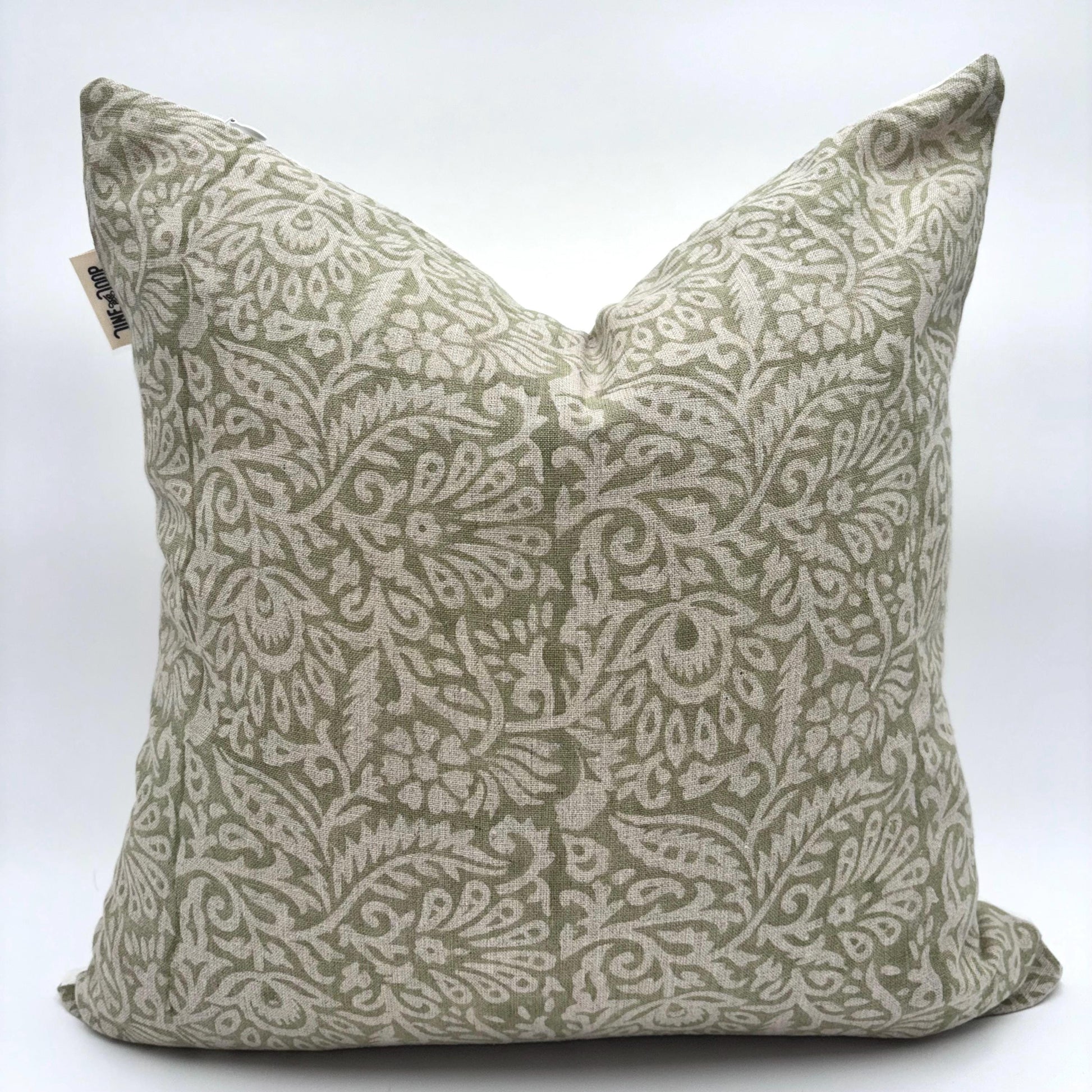 Our "Olive" pillow cover features a delicate oatmeal-colored floral pattern on a light olive-green background. This neutral color palette goes well with green and beige cushions.