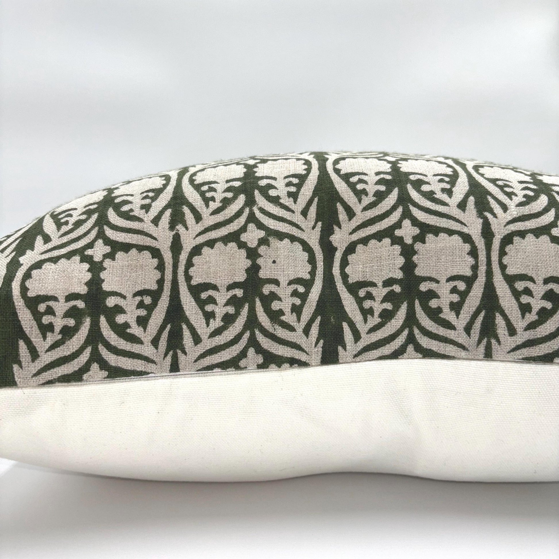 The block print on the linen is entirely done by hand, by master artisans. This is a four-hundred-year-old art form that has been passed down generations and takes an incredible amount of precision and practice to get right. The blocks are carved by artisans, the colors are mixed by a master color artist, and it is then printed on by a block printer. The linen is then air dried and then stitched into cushion covers.