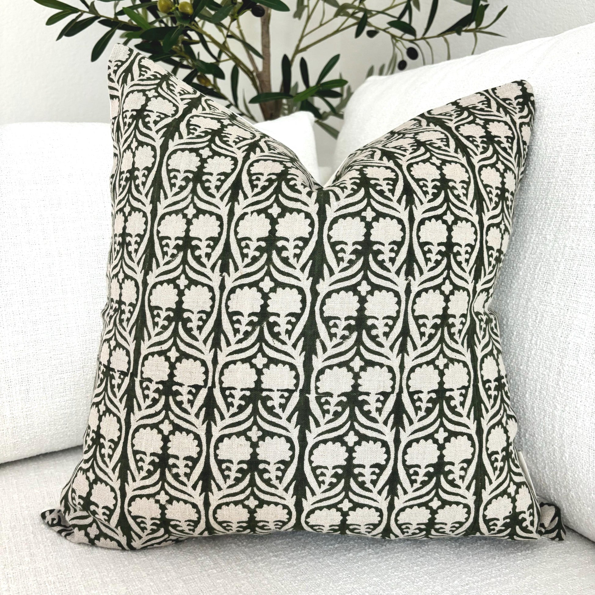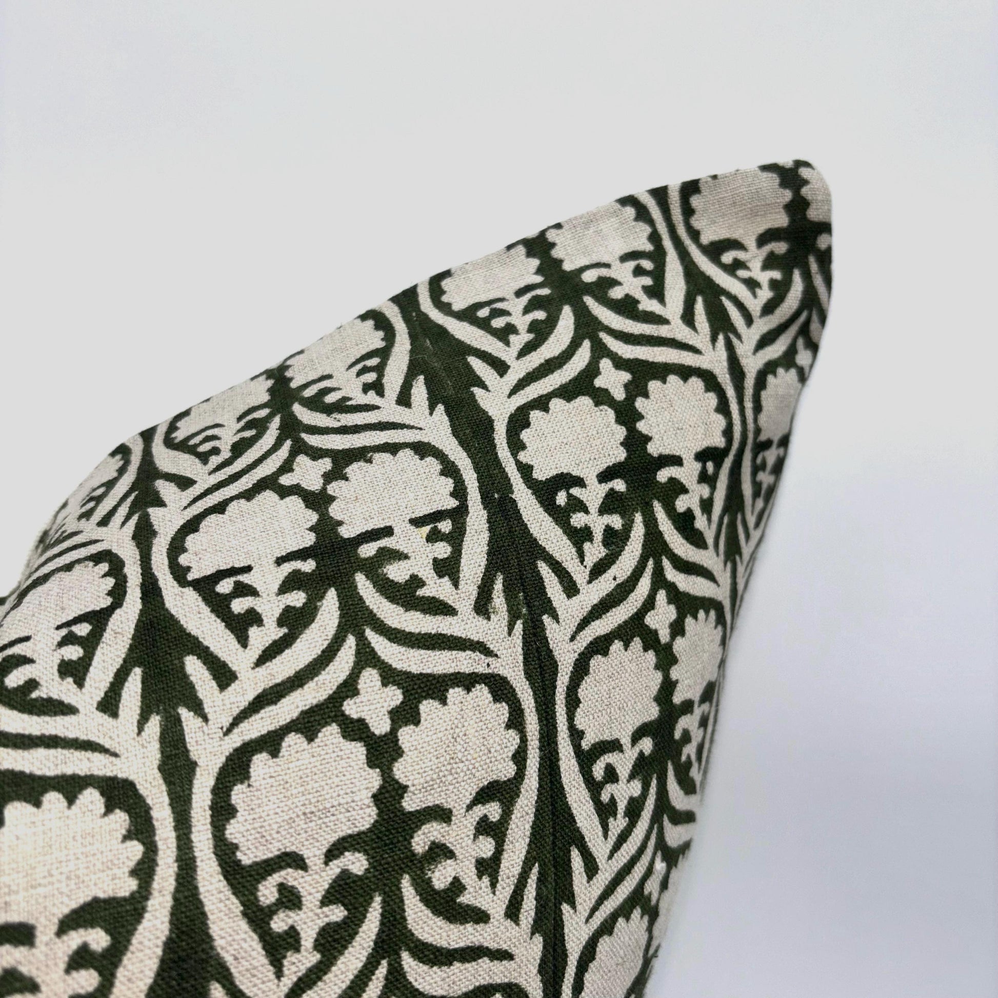 Our "Eva" pillow cover has a beautiful oatmeal-colored floral pattern on a deep olive green-colored background. This pillow cover will pair well with greens and beiges.