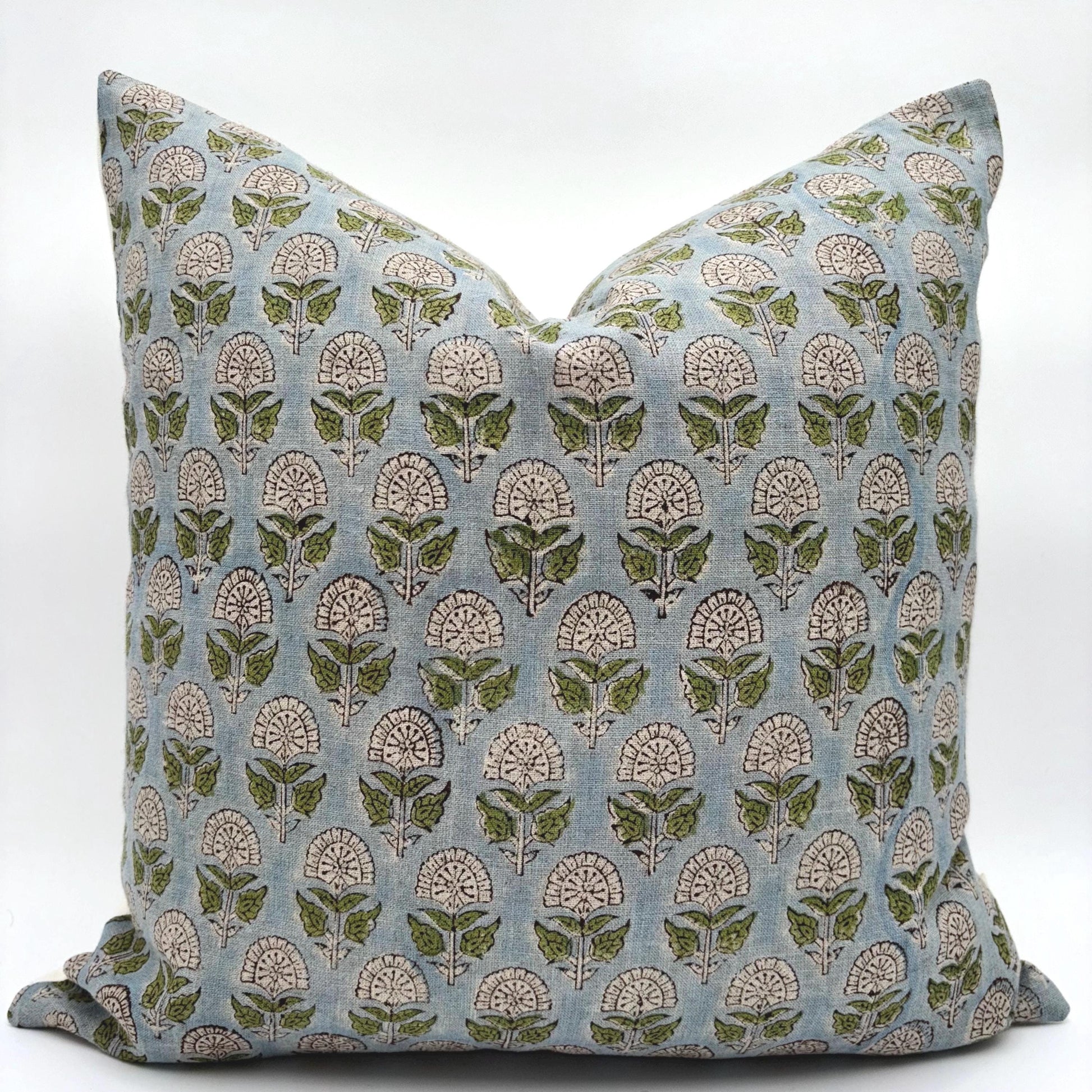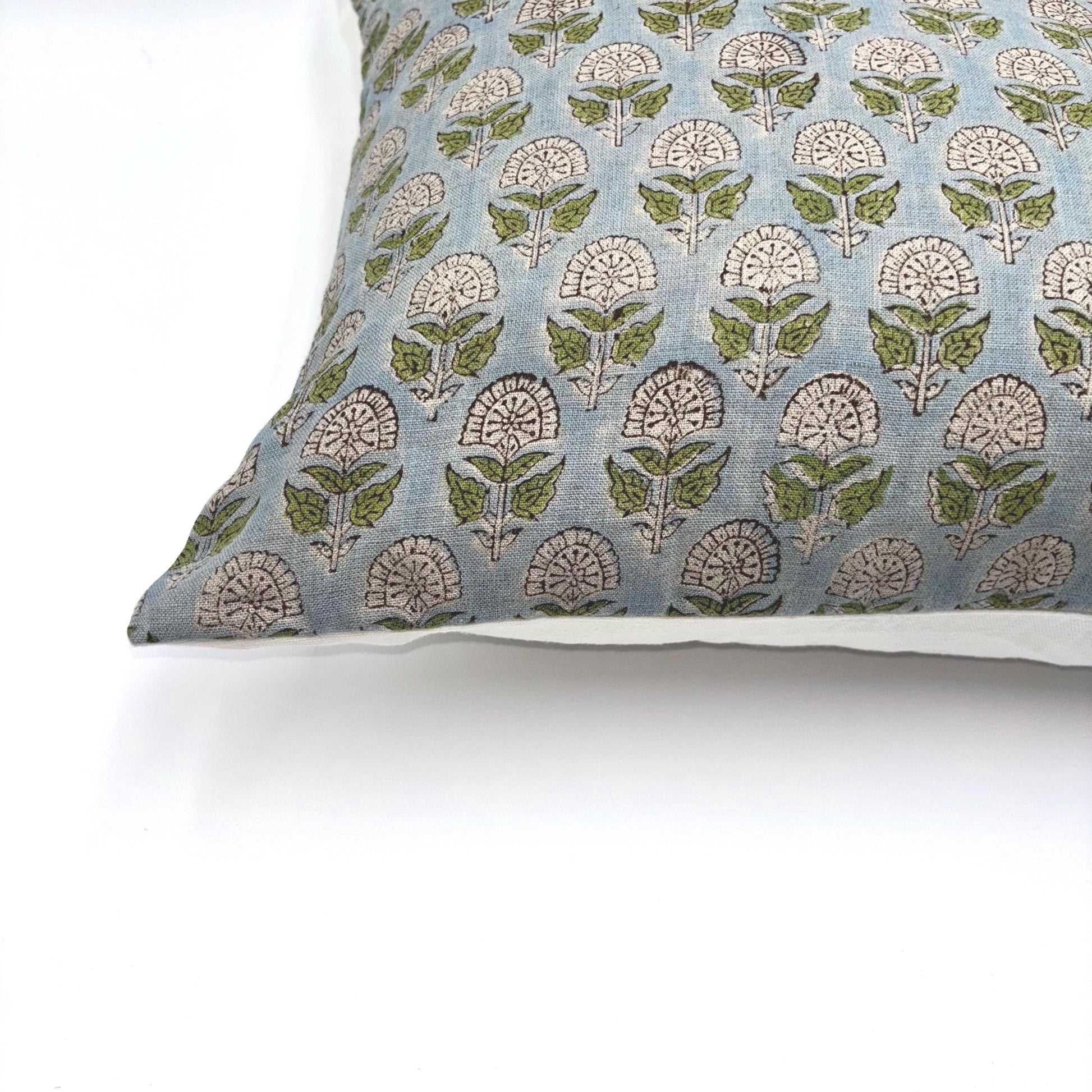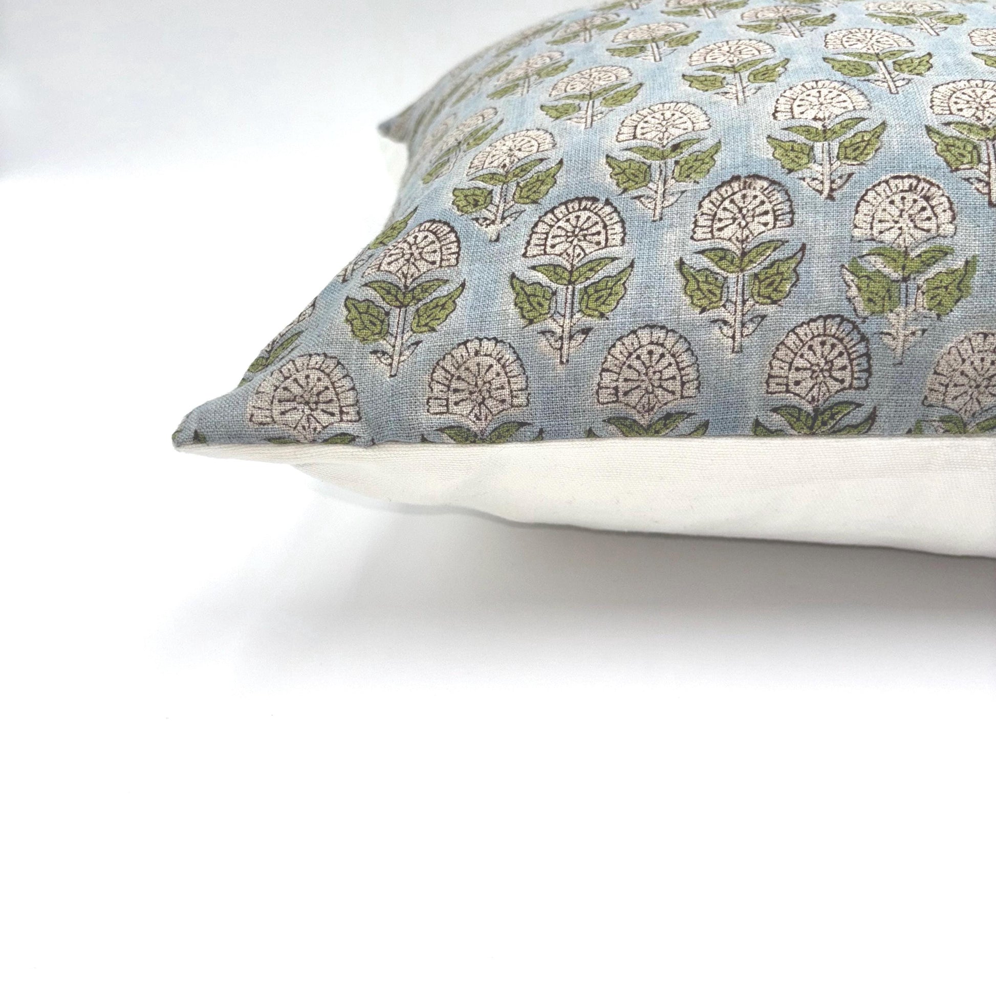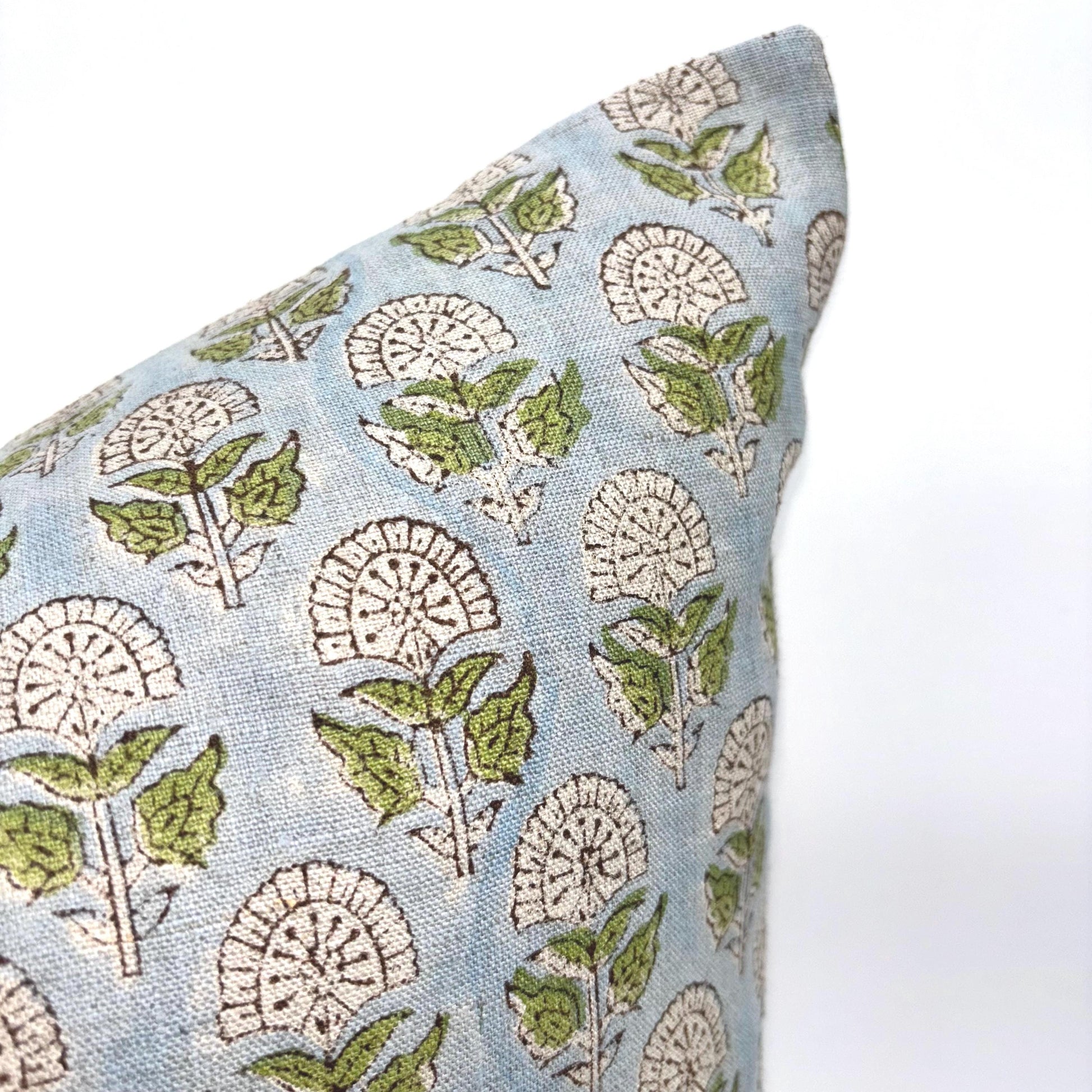 Hazel - hand block printed linen pillow cover (blue, green)