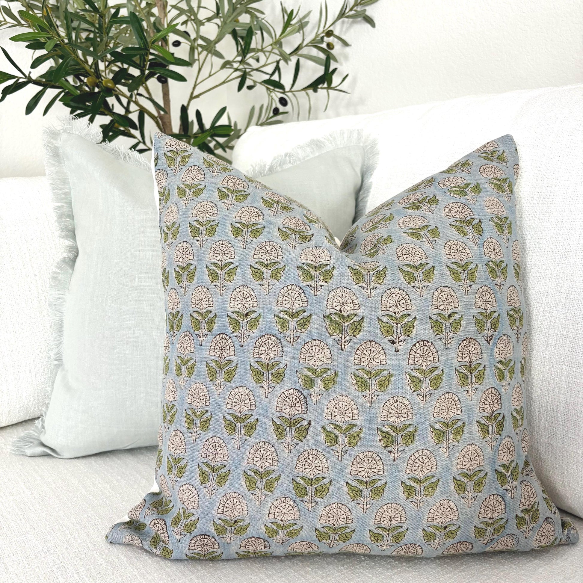Our "Hazel" pillow cover features a floral pattern with spring green on a sky-blue background. This calming color palette screams spring and goes well with light blue and beige cushions
