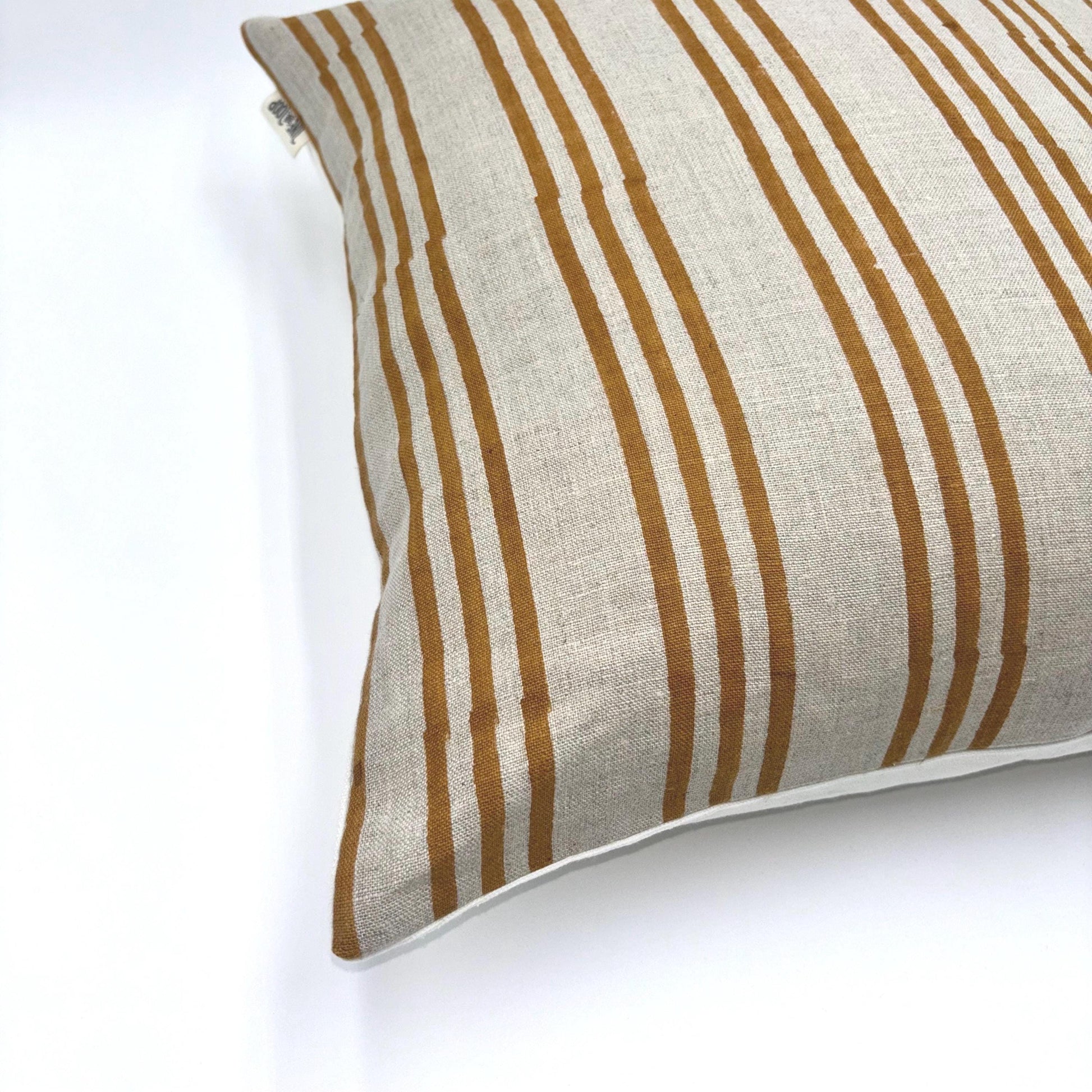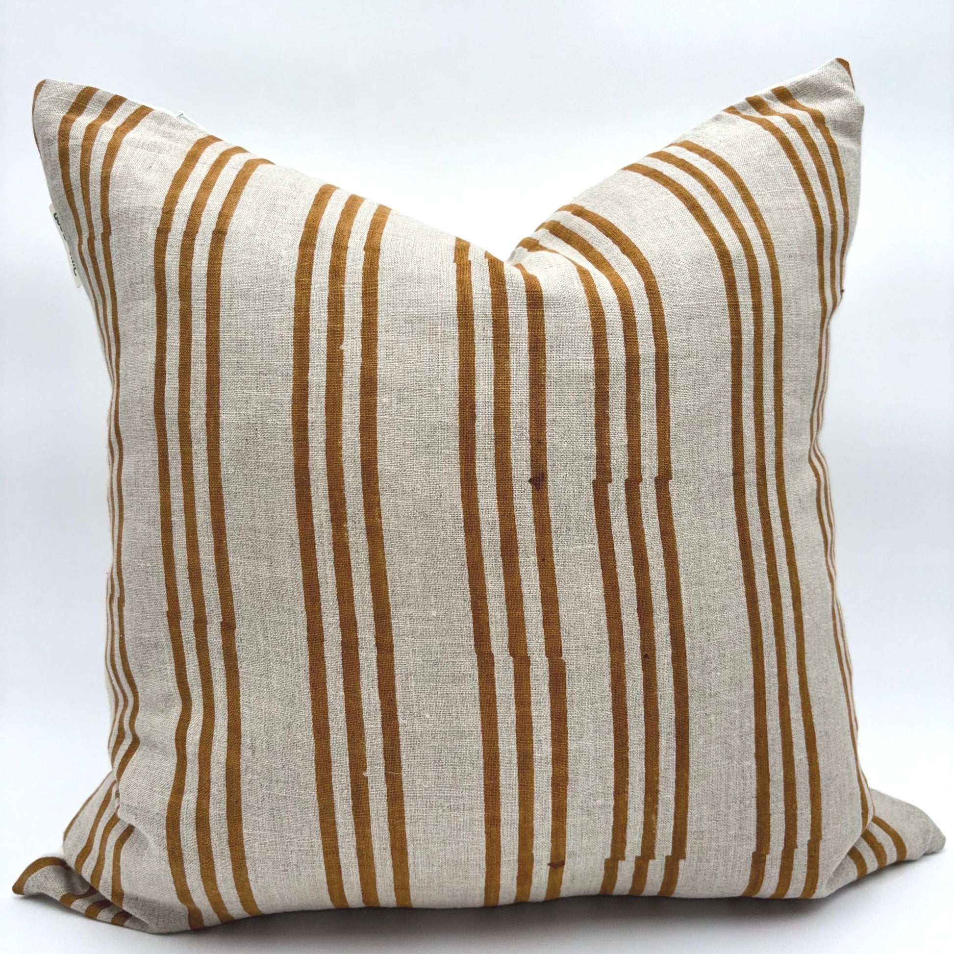 Our "Reina" pillow cover features an orange/rust striped pattern on an oatmeal background. This simple versatile pattern will pair well with a warm neural color palette.