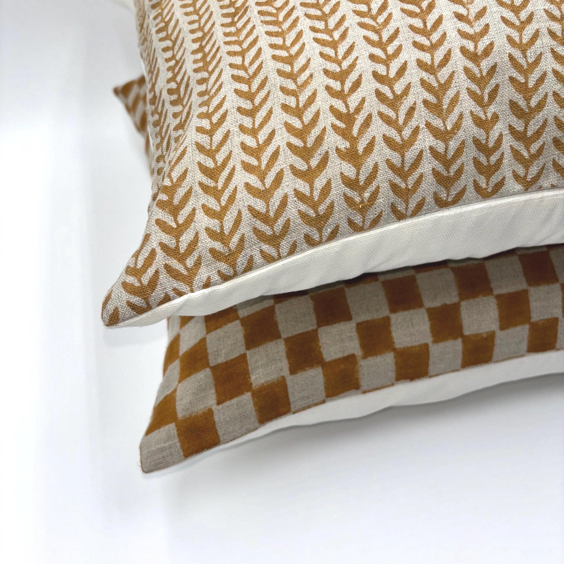 The block print on the linen is entirely done by hand, by master artisans. This is a four-hundred-year-old art form that has been passed down generations and takes an incredible amount of precision and practice to get right. The blocks are carved by artisans, the colors are mixed by a master color artist, and it is then printed on by a block printer. The linen is then air dried and then stitched into pillow covers.