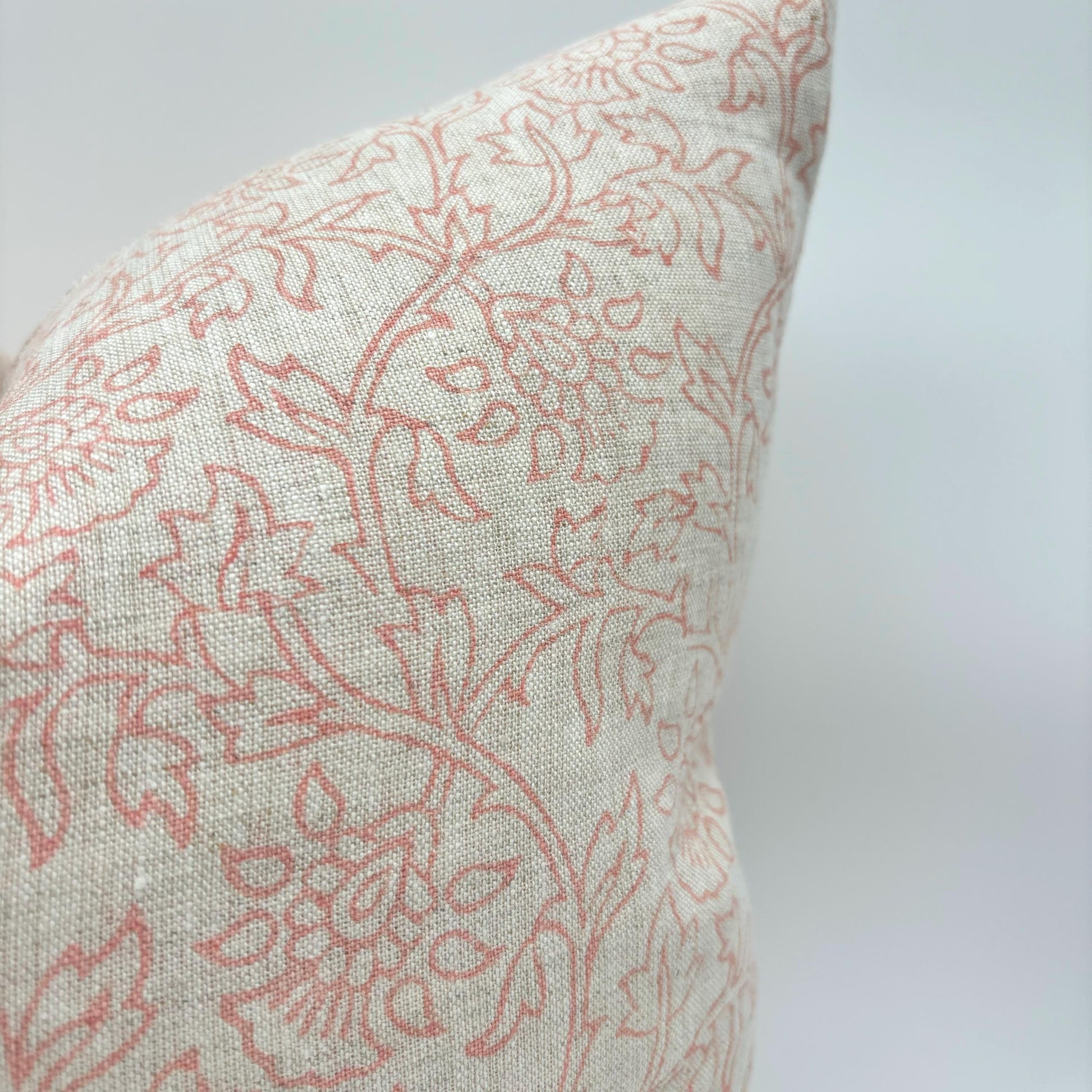 Our "Kate" pillow cover features a delicate pink floral pattern on a light oatmeal colored background. This elegant pillow cover pairs well with pink and off-white pillows.
