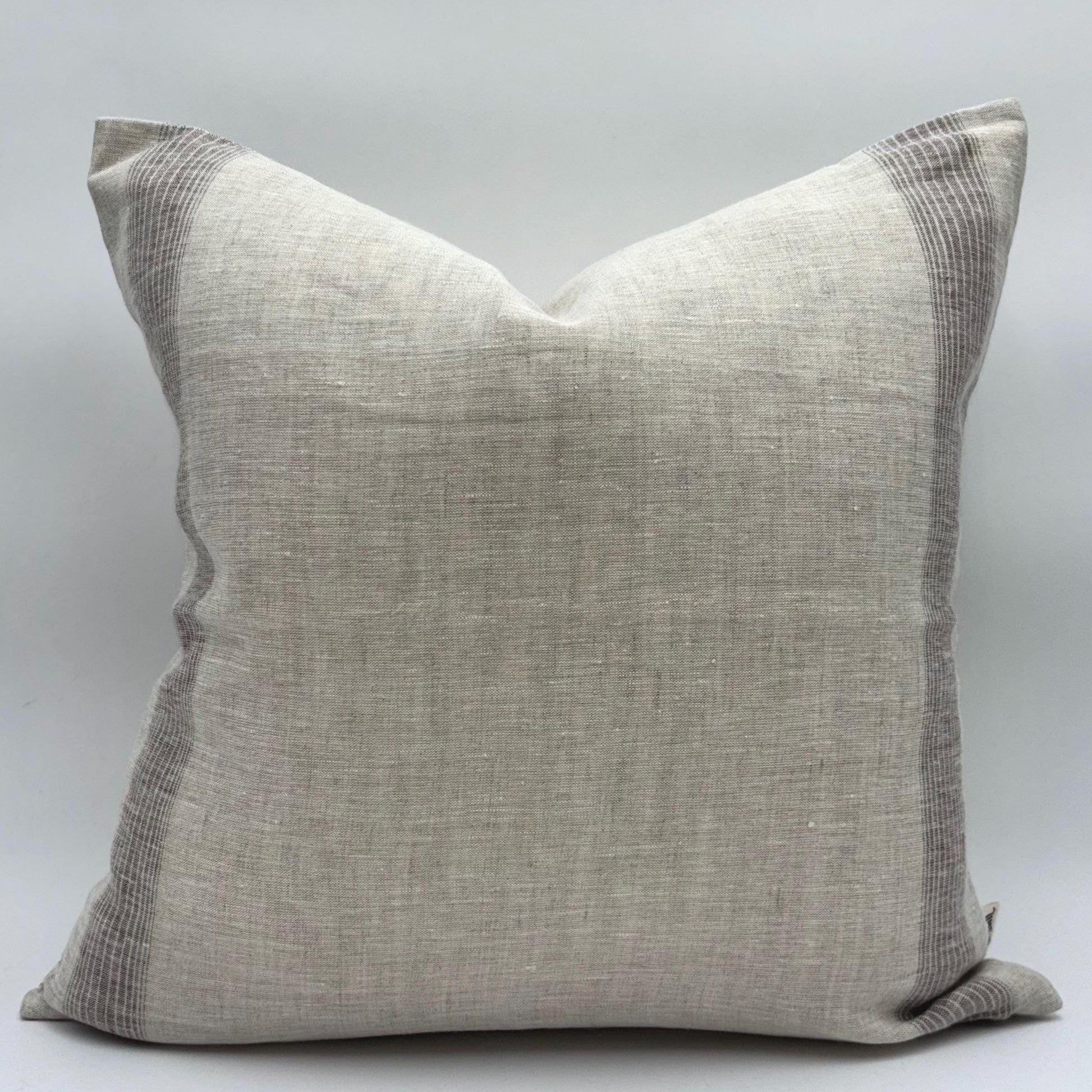 Our "Chloe" pillow cover has faded brown stripes on the sides of the pillow cover. The rest of the pillow cover is a natural oatmeal color.T he fabric used is yarn dyed linen which is soft and durable. The fabric has been pre-washed to make it softer and avoid shrinkage. The front and the back are made of 100% linen. The inside of the pillow cover has an additional cotton lining to make the pillow cover more durable.