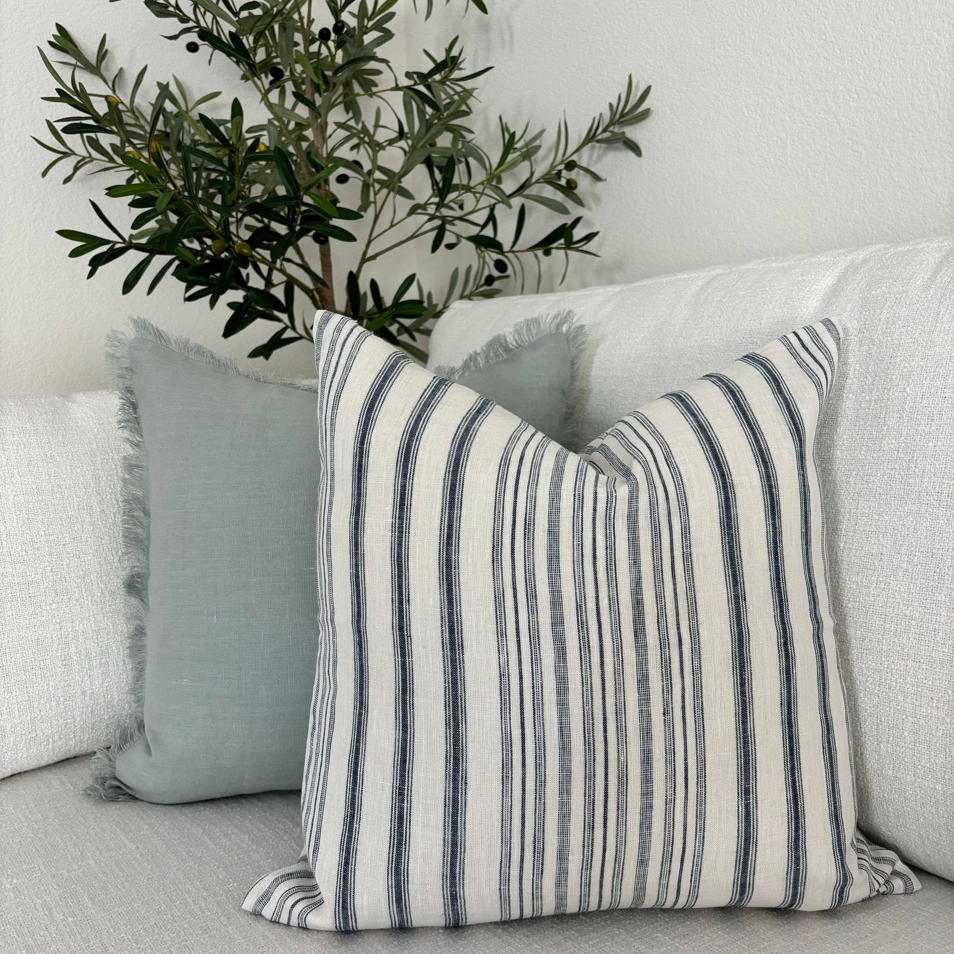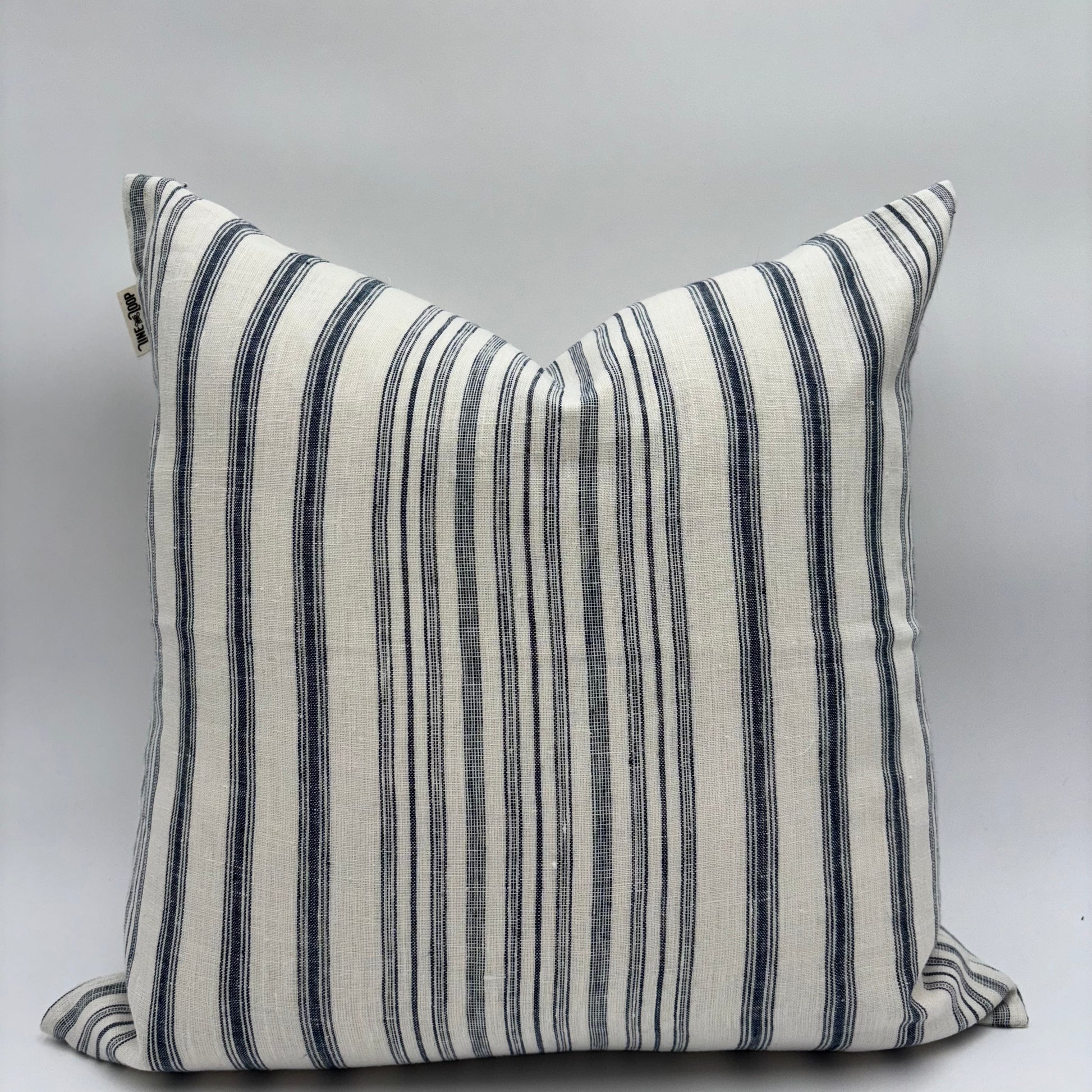 Our "Ellie" pillow cover has blue stripes of varying thickness on a white background. The fabric used is yarn dyed linen which is soft and durable. The fabric has been pre-washed to make it softer and avoid shrinkage. The front and the back are made of 100% linen. The inside of the pillow cover has an additional cotton lining to make the pillow cover more durable.
