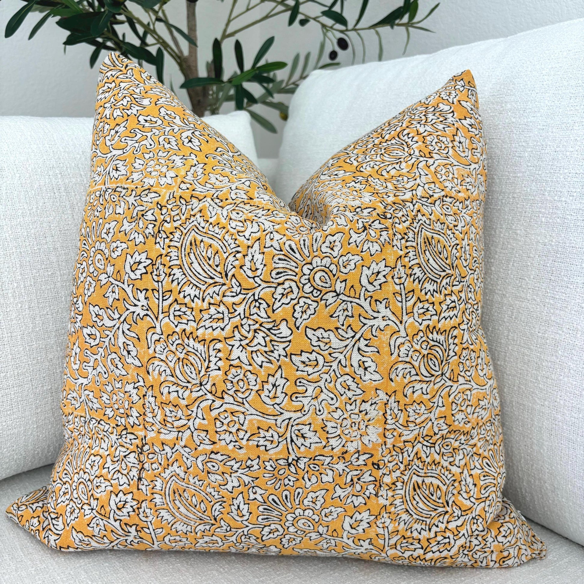 Our "Amira" pillow cover features a delicate black floral pattern on a mustard-yellow background. This color palette pairs well with yellow, black and white pillows