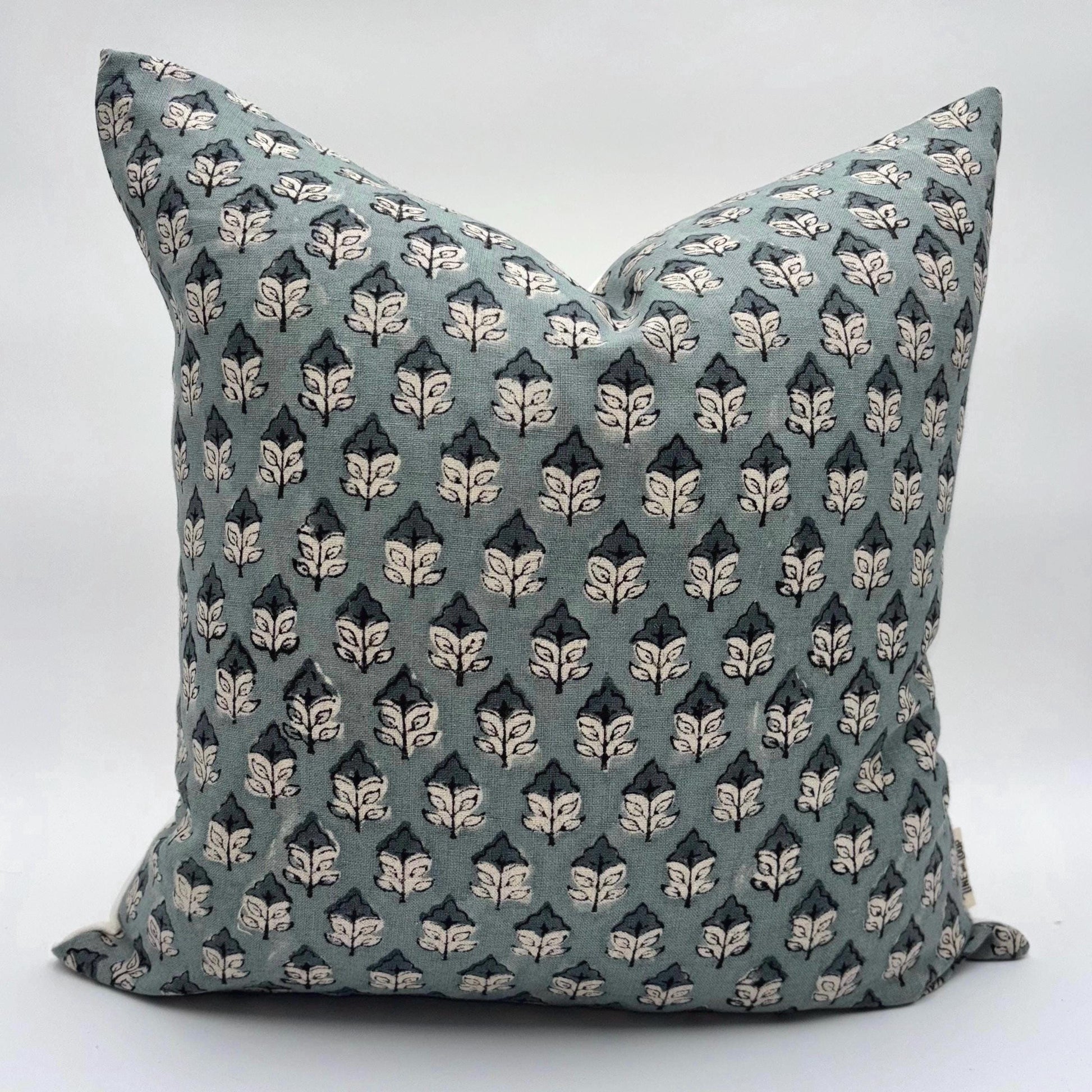 The block print on the linen is entirely done by hand, by master artisans. This is a four-hundred-year-old art form that has been passed down generations and takes an incredible amount of precision and practice to get right. The blocks are carved by artisans, the colors are mixed by a master color artist, and it is then printed on by a block printer. The linen is then air dried and then stitched into pillow covers.