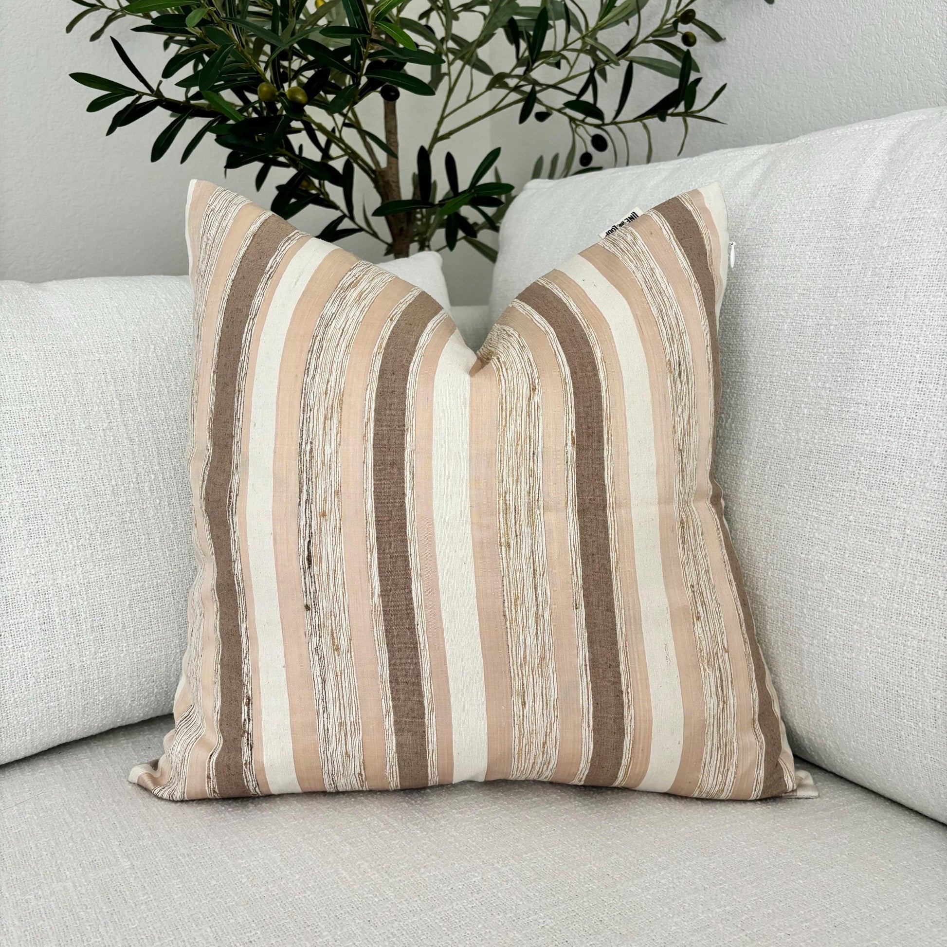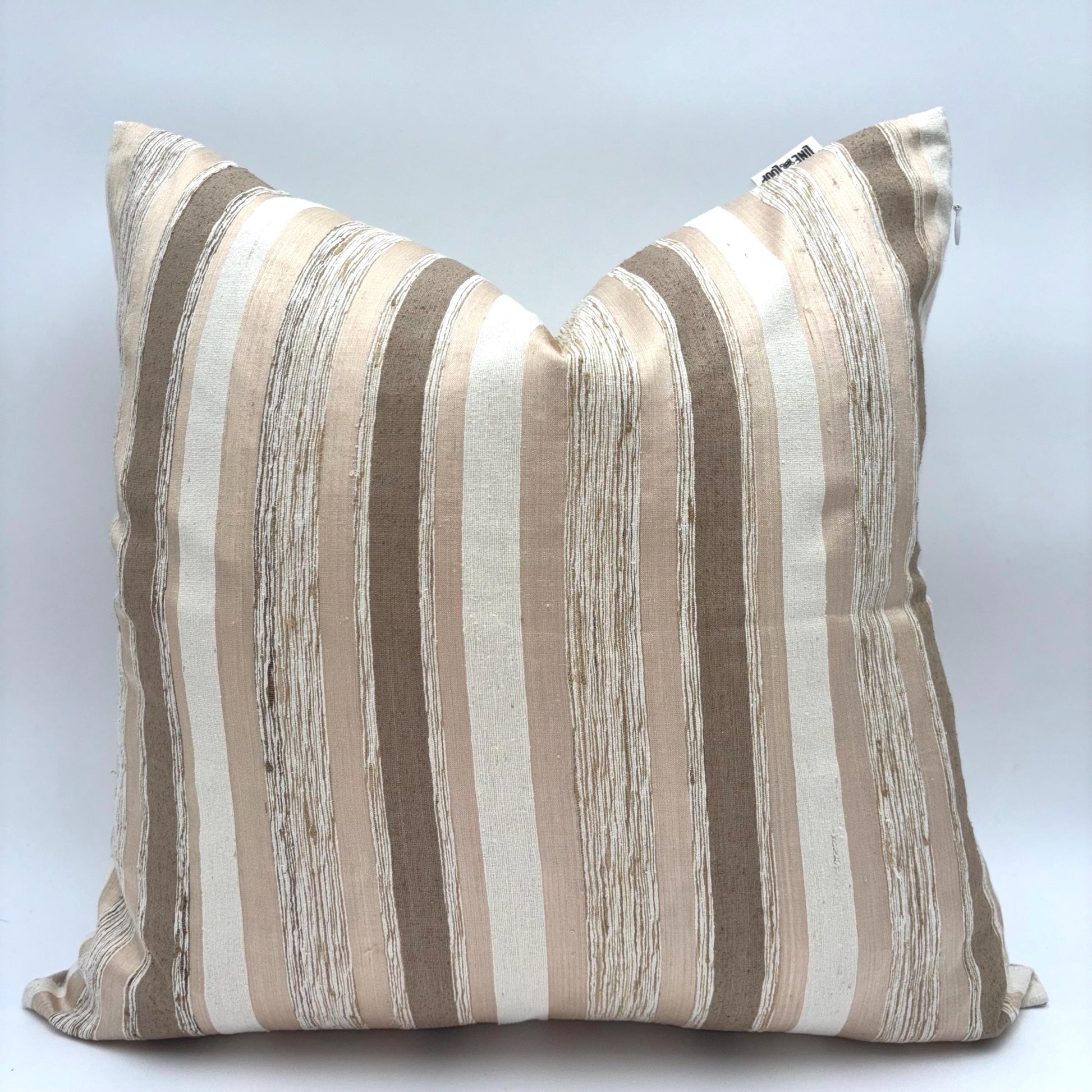 Our "Nicholas" pillow cover features soft pink, light beige and oatmeal colored stripes. Handspun and hand loomed silk slub textured fabric has been used for the front of the pillow. Silk slub textured fabric has a very luxurious and textured feel to it. The slightly uneven fabric and small variation in color make this unique and appealing.